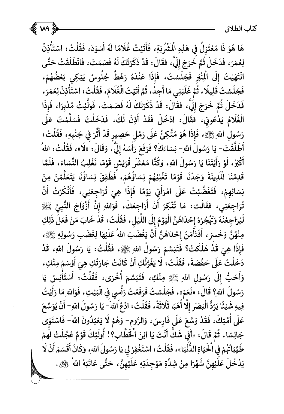 غُلَامًا لَهُ أَسْوَدَ، فَقُلْتُ: اسْتَأْذِنْ لِعُمَرَ، فَدَخَلَ ثُمَّ خَرَجَ إِلَيَّ، فقَالَ: قَدْ ذَكَرْتُكَ لَهُ فَصَمَتَ، فَانْطَلَقْتُ حَتَّى انْتَهَيْتُ إِلَى الْمِنْبَرِ فَجَلَسْتُ، فَإِذَا عَنْدَهُ رَهْطٌ جُلُوسٌ يَبْكِي بَعْضُهُمْ، فَجَلَسْتُ قَلِيلًا، ثُمَّ غَلَبَنِي مَا أَجِدُ، ثُمَّ أَتَيْتُ الْغُلَامَ، فَقُلْتُ: اسْتَأْذِنْ لِعُمَرَ، فَدَخَلَ ثُمَّ خَرَجَ إِلَيَّ، فقَالَ: قَدْ ذَكَرْتُكَ لَهُ فَصَمَتَ، فَوَلَّيْتُ مُدْبِرًا، فَإِذَا الْغُلَامُ يَدْعُونِي، فقَالَ: ادْخُلْ فَقَدْ أَذِنَ لَكَ، فَدَخَلْتُ فَسَلَّمْتُ عَلَى رَسُولِ اللَّهِ صلى الله عليه وسلم، فَإِذَا هُوَ مُتَّكِئٌ عَلَى رَمْلِ حَصِيرٍ قَدْ أَثَّرَ فِي جَنْبِهِ، فَقُلْتُ: أَطَلَّقْتَ- يَا رَسُولَ اللَّهِ- نِسَاءَكَ؟ فَرَفَعَ رَأْسَهُ إِلَيَّ، وَقَالَ: لَا، فَقُلْتُ: اللَّهُ أَكْبَرُ، لَوْ رَأَيْتَنَا يَا رَسُولَ اللَّهِ، وَكُنَّا مَعْشَرَ قُرَيْشٍ قَوْمًا نَغْلِبُ النِّسَاءَ، فَلَمَّا قَدِمْنَا الْمَدِينَةَ وَجَدْنَا قَوْمًا تَغْلِبُهُمْ نِسَاؤُهُمْ، فَطَفِقَ نِسَاؤُنَا يَتَعَلَّمْنَ مِنْ نِسَائِهِمْ، فَتَغَضَّبْتُ عَلَى امْرَأَتِي يَوْمًا فَإِذَا هِيَ تُرَاجِعَنِي، فَأَنْكَرْتُ أَنْ تُرَاجِعَنِي، فقَالَت: مَا تُنْكِرُ أَنْ أُرَاجِعَكَ، فَوَاللَّهِ إِنَّ أَزْوَاجَ النَّبِيِّ صلى الله عليه وسلم لَيُرَاجِعْنَهُ وَتَهْجُرُهُ إِحْدَاهُنَّ الْيَوْمَ إِلَى اللَّيْلِ، فَقُلْتُ: قَدْ خَابَ مَنْ فَعَلَ ذَلِكِ مِنْهُنَّ وَخَسِرَ، أَفَتَأْمَنُ إِحْدَاهُنَّ أَنْ يَغْضَبَ اللَّهُ عَلَيْهَا لِغَضَبِ رَسُولِهِ صلى الله عليه وسلم، فَإِذَا هِيَ قَدْ هَلَكَتْ؟ فَتَبَسَّمَ رَسُولُ اللَّهِ صلى الله عليه وسلم، فَقُلْتُ: يَا رَسُولَ اللَّهِ، قَدْ دَخَلْتُ عَلَى حَفْصَةَ، فَقُلْتُ: لَا يَغُرَّنَّكِ أَنْ كَانَتْ جَارَتُكِ