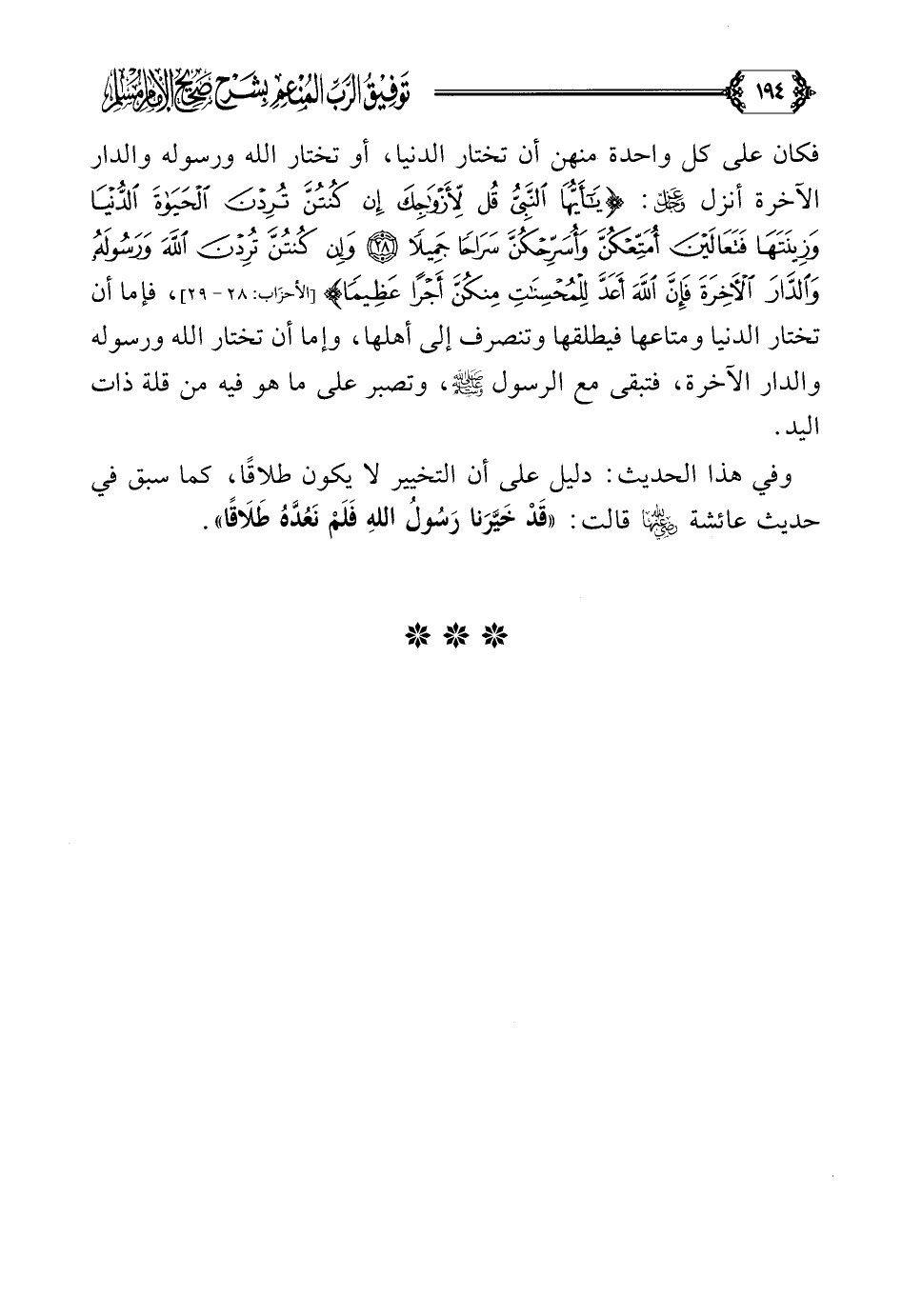وفي هذا الحديث: دليل على أن التخيير لا يكون طلاقًا، كما سبق في حديث عائشة رضي الله عنها قالت: ((قَدْ خَيَّرَنا رَسُولُ اللهِ فَلَمْ نَعُدَّهُ طَلَاقًا)).