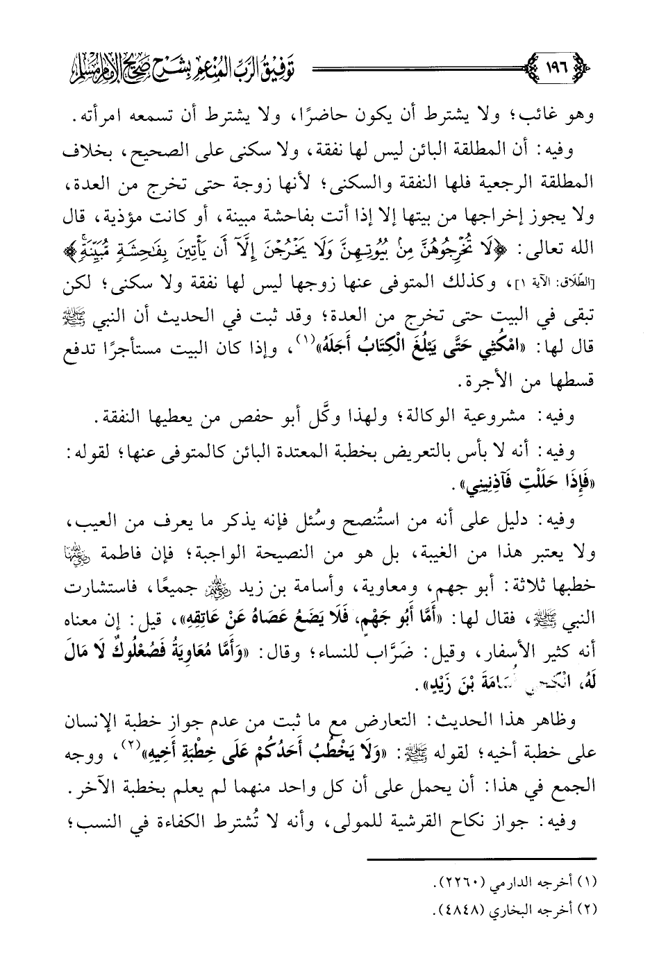 وفيه: أن المطلقة البائن ليس لها نفقة، ولا سكنى على الصحيح، بخلاف المطلقة الرجعية فلها النفقة والسكنى؛ لأنها زوجة حتى تخرج من العدة، ولا يجوز إخراجها من بيتها إلا إذا أتت بفاحشة مبينة، أو كانت مؤذية، قال الله تعالى: {لا تخرجوهن من بيوتهن ولا يخرجن إلا أن يأتين بفاحشة مبينة}، وكذلك المتوفى عنها زوجها ليس لها نفقة ولا سكنى؛ لكن تبقى في البيت حتى تخرج من العدة؛ وقد ثبت في الحديث أن النبي صلى الله عليه وسلم قال لها: ((امْكُثِي حَتَّى يَبْلُغَ الْكِتَابُ أَجَلَهُ)) (¬١)، وإذا كان البيت مستأجرًا تدفع قسطها من الأجرة.