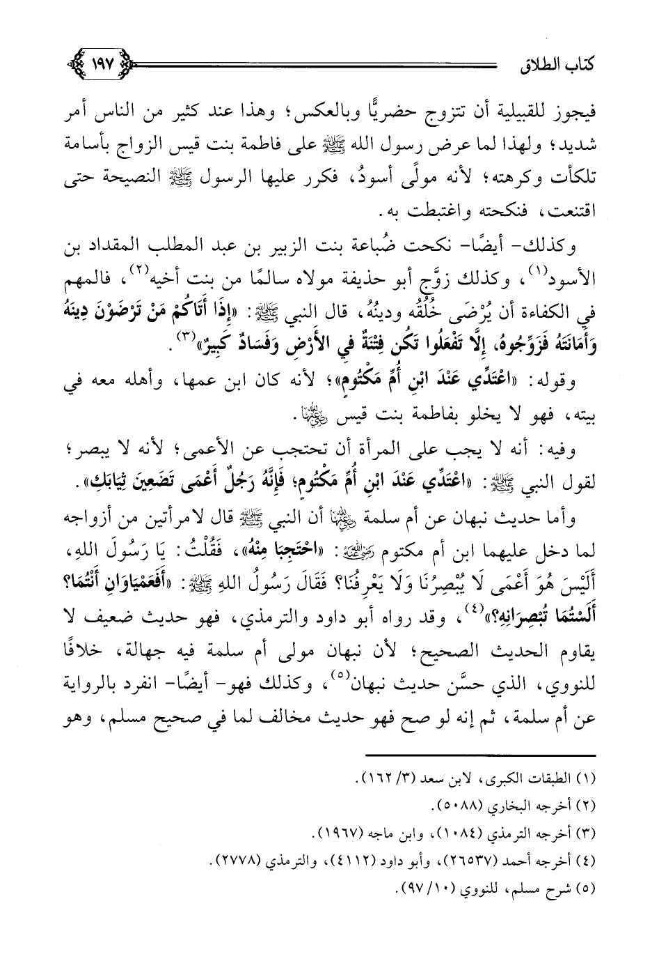 وكذلك- أيضًا- نكحت ضُباعة بنت الزبير بن عبد المطلب المقداد بن الأسود (¬١)، وكذلك زوَّج أبو حذيفة مولاه سالمًا من بنت أخيه (¬٢)، فالمهم في الكفاءة أن يُرْضَى خُلُقُه ودينُهُ، قال النبي صلى الله عليه وسلم: ((إِذَا أَتَاكُمْ مَنْ تَرْضَوْنَ دِينَهُ وَأَمَانَتَهُ فَزَوِّجُوهُ، إِلَّا تَفْعَلُوا تَكُن فِتْنَةٌ فِي الأَرْضِ وَفَسَادٌ كَبِيرٌ)) (¬٣).