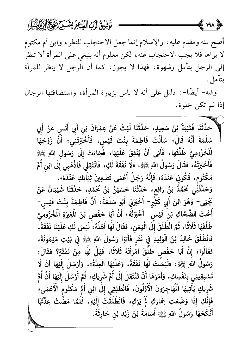 وَحَدَّثَنِي مُحَمَّدُ بْنُ رَافِعٍ، حَدَّثَنَا حُسَيْنُ بْنُ مُحَمَّدٍ، حَدَّثَنَا شَيْبَانُ عَنْ يَحْيَى- وَهُوَ ابْنُ أَبِي كَثِيرٍ- أَخْبَرَنِي أَبُو سَلَمَةَ: أَنَّ فَاطِمَةَ بِنْتَ قَيْسٍ- أُخْتَ الضَّحَّاكِ بْنِ قَيْسٍ- أَخْبَرَتْهُ: أَنَّ أَبَا حَفْصِ بْنَ الْمُغِيرَةِ الْمَخْزُومِيَّ طَلَّقَهَا ثَلَاثًا، ثُمَّ انْطَلَقَ إِلَى الْيَمَنِ، فقَالَ لَهَا أَهْلُهُ: لَيْسَ لَكِ عَلَيْنَا نَفَقَةٌ، فَانْطَلَقَ خَالِدُ بْنُ الْوَلِيدِ فِي نَفَرٍ فَأَتَوْا رَسُولَ اللَّهِ صلى الله عليه وسلم فِي بَيْتِ مَيْمُونَةَ، فقَالُوا: إِنَّ أَبَا حَفْصٍ طَلَّقَ امْرَأَتَهُ ثَلَاثًا، فَهَلْ لَهَا مِنْ نَفَقَةٍ؟ فقَالَ: رَسُولُ اللَّهِ صلى الله عليه وسلم: ((لَيْسَتْ لَهَا نَفَقَةٌ، وَعَلَيْهَا الْعِدَّةُ))، وَأَرْسَلَ إِلَيْهَا أَنْ لَا تَسْبِقِينِي بِنَفْسِكِ، وَأَمَرَهَا أَنْ تَنْتَقِلَ إِلَى أُمِّ شَرِيكٍ، ثُمَّ أَرْسَلَ إِلَيْهَا أَنَّ أُمَّ شَرِيكٍ يَأْتِيهَا الْمُهَاجِرُونَ الْأَوَّلُونَ، فَانْطَلِقِي إِلَى ابْنِ أُمِّ مَكْتُومٍ الْأَعْمَى؛ فَإِنَّكِ إِذَا وَضَعْتِ خِمَارَكِ لَمْ يَرَكِ، فَانْطَلَقَتْ إِلَيْهِ، فَلَمَّا مَضَتْ عِدَّتُهَا أَنْكَحَهَا رَسُولُ اللَّهِ صلى الله عليه وسلم أُسَامَةَ بْنَ زَيْدِ بْنِ حَارِثَةَ)).
