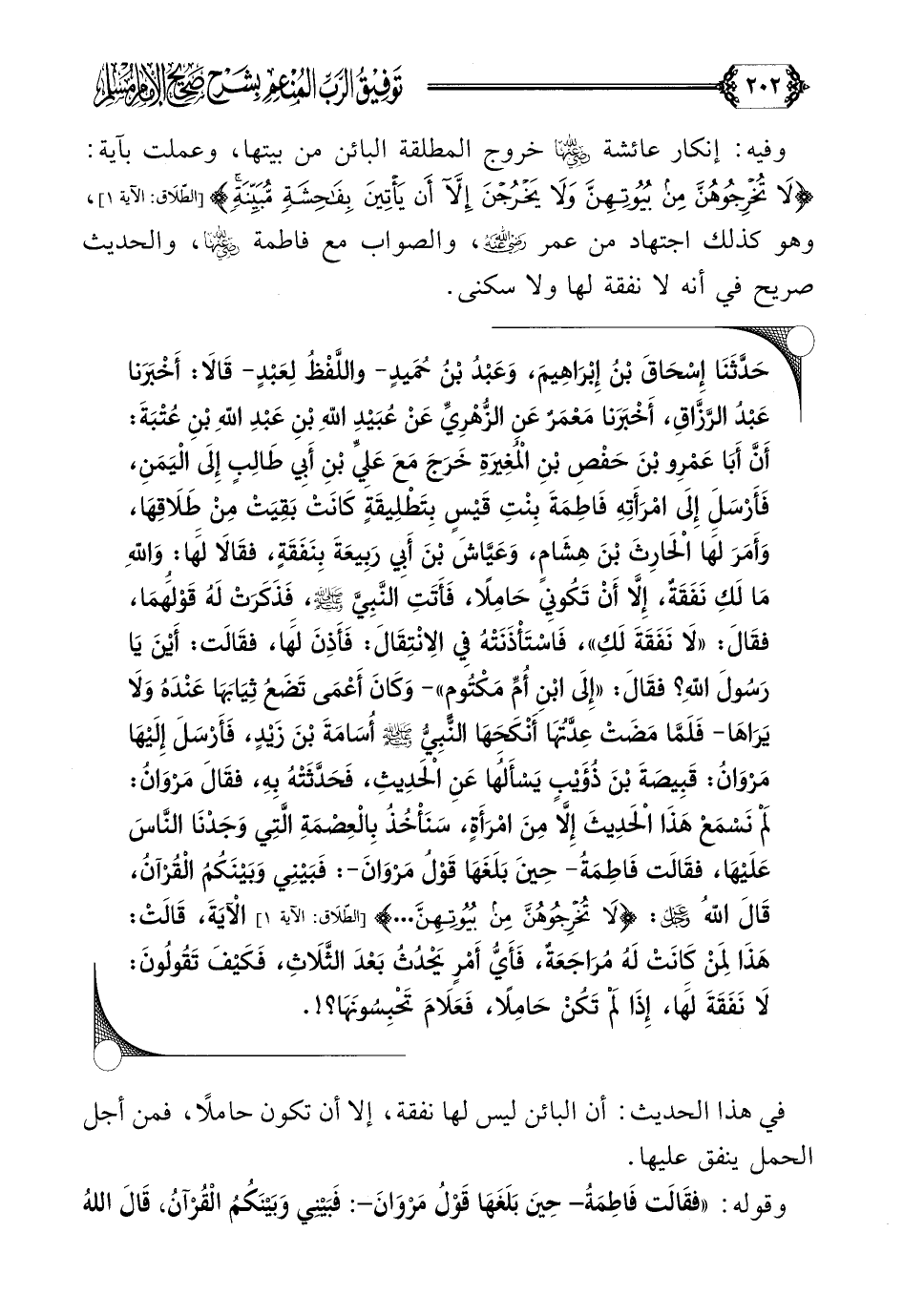 وفيه: إنكار عائشة رضي الله عنها خروج المطلقة البائن من بيتها، وعملت بآية: {لا تخرجوهن من بيوتهن ولا يخرجن إلا أن يأتين بفاحشة مبينة}، وهو كذلك اجتهاد من عمر رضي الله عنه، والصواب مع فاطمة رضي الله عنها، والحديث صريح في أنه لا نفقة لها ولا سكنى.