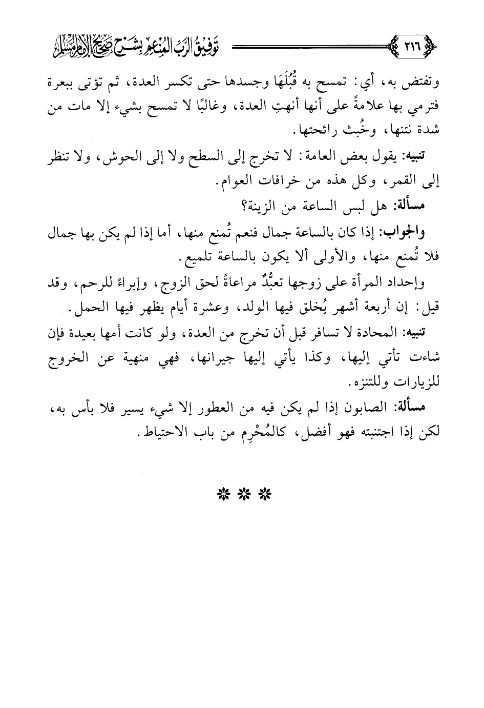 تنبيه: يقول بعض العامة: لا تخرج إلى السطح ولا إلى الحوش، ولا تنظر إلى القمر، وكل هذه من خرافات العوام.