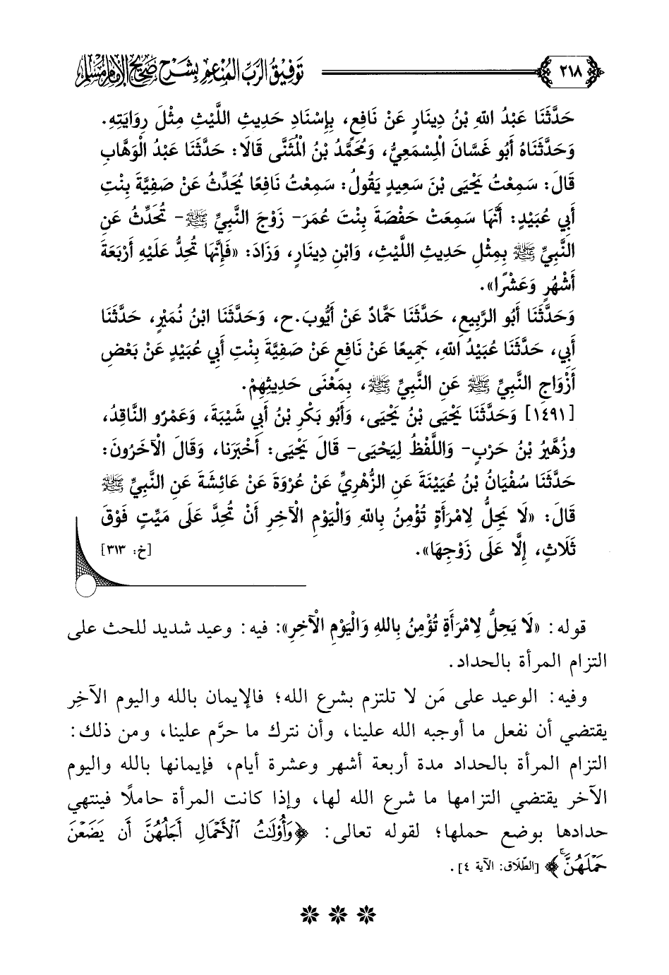 [١٤٩١] وَحَدَّثَنَا يَحْيَى بْنُ يَحْيَى، وَأَبُو بَكْرِ بْنُ أَبِي شَيْبَةَ، وَعَمْرٌو النَّاقِدُ، وزُهَّيرُ بْنُ حَرْبٍ- وَاللَّفْظُ لِيَحْيَى- قَالَ يَحْيَى: أَخْبَرَنا، وَقَالَ الْآخَرُونَ: حَدَّثَنَا سُفْيَانُ بْنُ عُيَيْنَةَ عَنِ الزُّهْرِيِّ عَنْ عُرْوَةَ عَنْ عَائِشَةَ عَنِ النَّبِيِّ صلى الله عليه وسلم قَالَ: ((لَا يَحِلُّ لِامْرَأَةٍ تُؤْمِنُ بِاللَّهِ وَالْيَوْمِ الْآخِرِ أَنْ تُحِدَّ عَلَى مَيِّتٍ فَوْقَ ثَلَاثٍ، إِلَّا عَلَى زَوْجِهَا)).