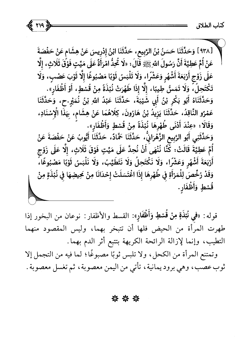 [٩٣٨] وَحَدَّثَنَا حَسَنُ بْنُ الرَّبِيعِ، حَدَّثَنَا ابْنُ إِدْرِيسَ عَنْ هِشَامٍ عَنْ حَفْصَةَ عَنْ أُمِّ عَطِيَّةَ أَنَّ رَسُولَ اللَّهِ صلى الله عليه وسلم قَالَ: ((لَا تُحِدُّ امْرَأَةٌ عَلَى مَيِّتٍ فَوْقَ ثَلَاثٍ، إِلَّا عَلَى زَوْجٍ أَرْبَعَةَ أَشْهُرٍ وَعَشْرًا، وَلَا تَلْبَسُ ثَوْبًا مَصْبُوغًا إِلَّا ثَوْبَ عَصْبٍ، وَلَا تَكْتَحِلُ، وَلَا تَمَسُّ طِيبًا، إِلَّا إِذَا طَهُرَتْ نُبْذَةً مِنْ قُسْطٍ، أَوْ أَظْفَارٍ)).