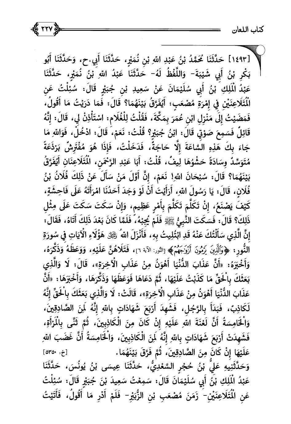 [١٤٩٣] حَدَّثَنَا مُحَمَّدُ بْنُ عَبْدِ اللهِ بْنِ نُمَيْرٍ، حَدَّثَنَا أَبِي. ح، وَحَدَّثَنَا أَبُو بَكْرِ بْنُ أَبِي شَيْبَةَ- وَاللَّفْظُ لَهُ- حَدَّثَنَا عَبْدُ اللهِ بْنُ نُمَيْرٍ، حَدَّثَنَا عَبْدُ الْمَلِكِ بْنُ أَبِي سُلَيْمَانَ عَنْ سَعِيدِ بْنِ جُبَيْرٍ قَالَ: سُئِلْتُ عَنِ الْمُتَلَاعِنَيْنِ فِي إِمْرَةِ مُصْعَبٍ: أَيُفَرَّقُ بَيْنَهُمَا؟ قَالَ: فَمَا دَرَيْتُ مَا أَقُولُ، فَمَضَيْتُ إِلَى مَنْزِلِ ابْنِ عُمَرَ بِمَكَّةَ، فَقُلْتُ لِلْغُلَامِ: اسْتَأْذِنْ لِي، قَالَ: إِنَّهُ قَائِلٌ فَسَمِعَ صَوْتِي قَالَ: ابْنُ جُبَيْرٍ؟ قُلْتُ: نَعَمْ، قَالَ: ادْخُلْ، فَوَاللهِ مَا جَاءَ بِكَ هَذِهِ السَّاعَةَ إِلَّا حَاجَةٌ، فَدَخَلْتُ، فَإِذَا هُوَ مُفْتَرِشٌ بَرْذَعَةً مُتَوَسِّدٌ وِسَادَةً حَشْوُهَا لِيفٌ، قُلْتُ: أَبَا عَبْدِالرَّحْمَنِ، الْمُتَلَاعِنَانِ أَيُفَرَّقُ بَيْنَهُمَا؟ قَالَ: سُبْحَانَ اللهِ! نَعَمْ، إِنَّ أَوَّلَ مَنْ سَأَلَ عَنْ ذَلِكَ فُلَانُ بْنُ فُلَانٍ، قَالَ: يَا رَسُولَ اللهِ، أَرَأَيْتَ أَنْ لَوْ وَجَدَ أَحَدُنَا امْرَأَتَهُ عَلَى فَاحِشَةٍ، كَيْفَ يَصْنَعُ، إِنْ تَكَلَّمَ تَكَلَّمَ بِأَمْرٍ عَظِيمٍ، وَإِنْ سَكَتَ سَكَتَ عَلَى مِثْلِ ذَلِكَ؟ قَالَ: فَسَكَتَ النَّبِيُّ صلى الله عليه وسلم فَلَمْ يُجِبْهُ، فَلَمَّا كَانَ بَعْدَ ذَلِكَ أَتَاهُ، فَقَالَ: إِنَّ الَّذِي سَأَلْتُكَ عَنْهُ قَدِ ابْتُلِيتُ بِهِ، فَأَنْزَلَ اللهُ عز وجل هَؤُلَاءِ الْآيَاتِ فِي سُورَةِ النُّورِ: {وَالَّذِينَ يَرْمُونَ أَزْوَاجَهُمْ}، فَتَلَاهُنَّ عَلَيْهِ، وَوَعَظَهُ وَذَكَّرَهُ، وَأَخْبَرَهُ: ((أَنَّ عَذَابَ الدُّنْيَا أَهْوَنُ مِنْ عَذَابِ الْآخِرَةِ))، قَالَ: لَا وَالَّذِي بَعَثَكَ بِالْحَقِّ مَا كَذَبْتُ عَلَيْهَا، ثُمَّ دَعَاهَا فَوَعَظَهَا وَذَكَّرَهَا، وَأَخْبَرَهَا: