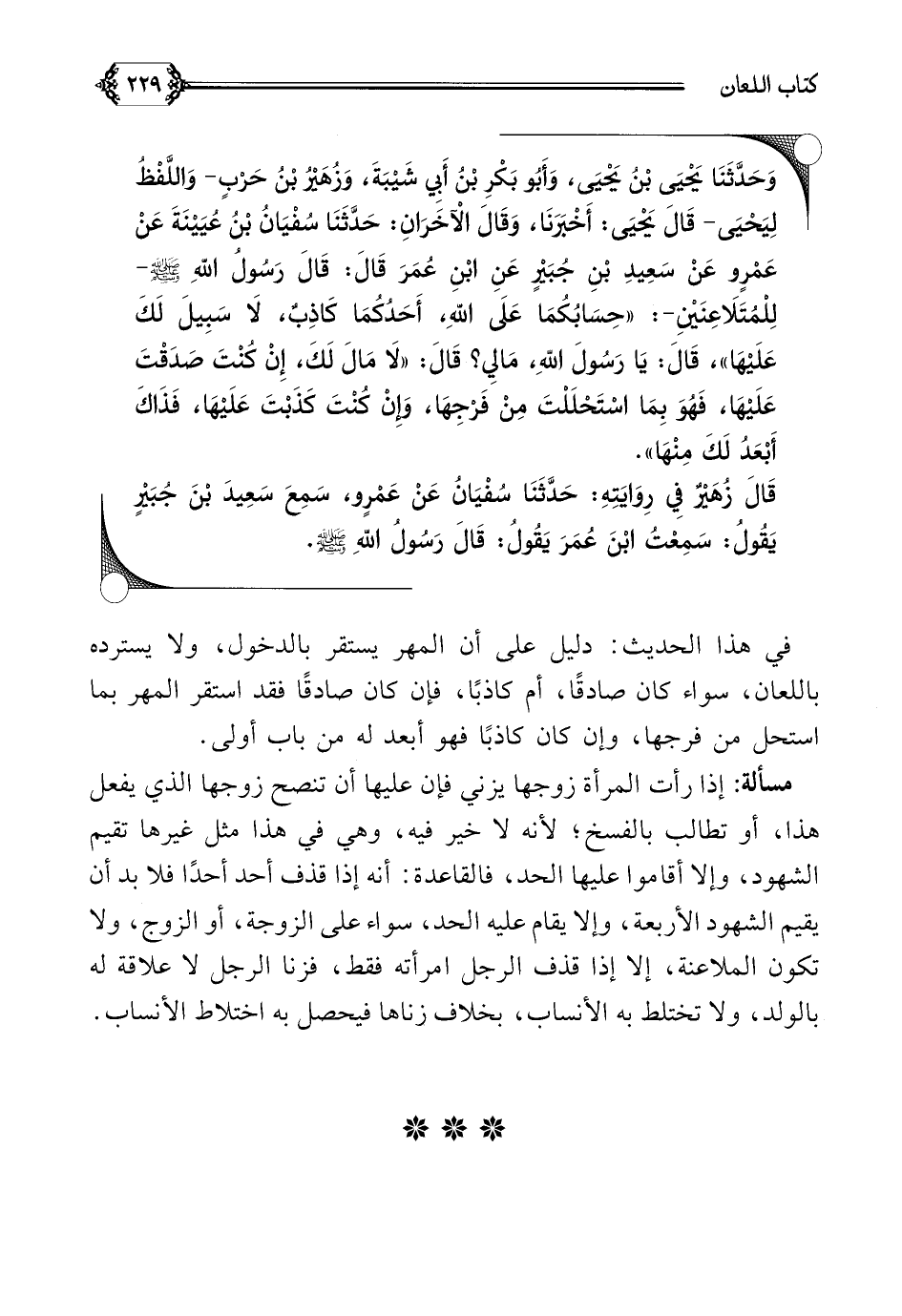 وَحَدَّثَنَا يَحْيَى بْنُ يَحْيَى، وَأَبُو بَكْرِ بْنُ أَبِي شَيْبَةَ، وَزُهَيْرُ بْنُ حَرْبٍ- وَاللَّفْظُ لِيَحْيَى- قَالَ يَحْيَى: أَخْبَرَنَا، وَقَالَ الْآخَرَانِ: حَدَّثَنَا سُفْيَانُ بْنُ عُيَيْنَةَ عَنْ عَمْرٍو عَنْ سَعِيدِ بْنِ جُبَيْرٍ عَنِ ابْنِ عُمَرَ قَالَ: قَالَ رَسُولُ اللهِ صلى الله عليه وسلم- لِلْمُتَلَاعِنَيْنِ-: ((حِسَابُكُمَا عَلَى اللهِ، أَحَدُكُمَا كَاذِبٌ، لَا سَبِيلَ لَكَ عَلَيْهَا))، قَالَ: يَا رَسُولَ اللهِ، مَالِي؟ قَالَ: ((لَا مَالَ لَكَ، إِنْ كُنْتَ صَدَقْتَ عَلَيْهَا، فَهُوَ بِمَا اسْتَحْلَلْتَ مِنْ فَرْجِهَا، وَإِنْ كُنْتَ كَذَبْتَ عَلَيْهَا، فَذَاكَ أَبْعَدُ لَكَ مِنْهَا)).