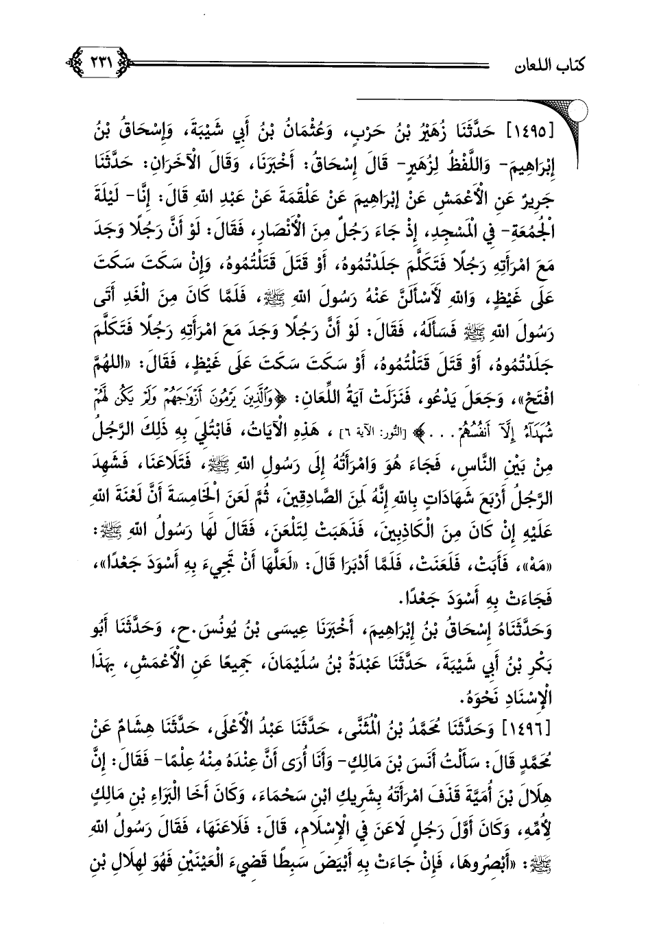 [١٤٩٥] حَدَّثَنَا زُهَيْرُ بْنُ حَرْبٍ، وَعُثْمَانُ بْنُ أَبِي شَيْبَةَ، وَإِسْحَاقُ بْنُ إِبْرَاهِيمَ- وَاللَّفْظُ لِزُهَيرٍ- قَالَ إِسْحَاقُ: أَخْبَرَنَا، وَقَالَ الْآخَرَانِ: حَدَّثَنَا جَرِيرٌ عَنِ الْأَعْمَشِ عَنْ إبْرَاهِيمَ عَنْ عَلْقَمَةَ عَنْ عَبْدِ اللهِ قَالَ: إِنَّا- لَيْلَةَ الْجُمُعَةِ- فِي الْمَسْجِدِ، إِذْ جَاءَ رَجُلٌ مِنْ الْأَنْصَارِ، فَقَالَ: لَوْ أَنَّ رَجُلًا وَجَدَ مَعَ امْرَأَتِهِ رَجُلًا فَتَكَلَّمَ جَلَدْتُمُوهُ، أَوْ قَتَلَ قَتَلْتُمُوهُ، وَإِنْ سَكَتَ سَكَتَ عَلَى غَيْظٍ، وَاللهِ لَأَسْأَلَنَّ عَنْهُ رَسُولَ اللهِ صلى الله عليه وسلم، فَلَمَّا كَانَ مِنَ الْغَدِ أَتَى رَسُولَ اللهِ صلى الله عليه وسلم فَسَأَلَهُ، فَقَالَ: لَوْ أَنَّ رَجُلًا وَجَدَ مَعَ امْرَأَتِهِ رَجُلًا فَتَكَلَّمَ جَلَدْتُمُوهُ، أَوْ قَتَلَ قَتَلْتُمُوهُ، أَوْ سَكَتَ سَكَتَ عَلَى غَيْظٍ، فَقَالَ: ((اللهُمَّ افْتَحْ))، وَجَعَلَ يَدْعُو، فَنَزَلَتْ آيَةُ اللِّعَانِ: {وَالَّذِينَ يَرْمُونَ أَزْوَاجَهُمْ وَلَمْ يَكُنْ لَهُمْ شُهَدَاءُ إِلا أَنْفُسُهُمْ}، هَذِهِ الْآيَاتُ، فَابْتُلِيَ بِهِ ذَلِكَ الرَّجُلُ مِنْ بَيْنِ النَّاسِ، فَجَاءَ هُوَ وَامْرَأَتُهُ إِلَى رَسُولِ اللهِ صلى الله عليه وسلم، فَتَلَاعَنَا، فَشَهِدَ الرَّجُلُ أَرْبَعَ شَهَادَاتٍ بِاللهِ إِنَّهُ لَمِنَ الصَّادِقِينَ، ثُمَّ لَعَنَ الْخَامِسَةَ أَنَّ لَعْنَةَ اللهِ عَلَيْهِ إِنْ كَانَ مِنَ الْكَاذِبِينَ، فَذَهَبَتْ لِتَلْعَنَ، فَقَالَ لَهَا رَسُولُ اللهِ صلى الله عليه وسلم: ((مَهْ))، فَأَبَتْ، فَلَعَنَتْ، فَلَمَّا أَدْبَرَا قَالَ: ((لَعَلَّهَا أَنْ تَجِيءَ بِهِ أَسْوَدَ جَعْدًا))، فَجَاءَتْ بِهِ أَسْوَدَ جَعْدًا.