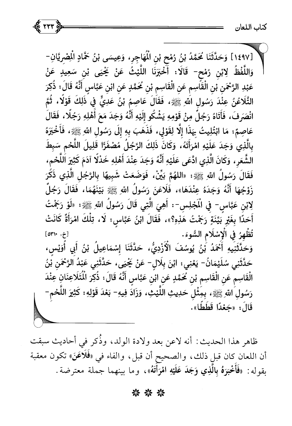 [١٤٩٧] وَحَدَّثَنَا مُحَمَّدُ بْنُ رُمْحِ بْنِ الْمُهَاجِرِ، وَعِيسَى بْنُ حَمَّادٍ الْمِصْرِيَّانِ- وَاللَّفْظُ لِابْنِ رُمْحٍ- قَالَا: أَخْبَرَنَا اللَّيْثُ عَنْ يَحْيَى بْنِ سَعِيدٍ عَنْ عَبْدِ الرَّحْمَنِ بْنِ الْقَاسِمِ عَنِ الْقَاسِمِ بْنِ مُحَمَّدٍ عَنِ ابْنِ عَبَّاسٍ أَنَّهُ قَالَ: ذُكِرَ التَّلَاعُنُ عِنْدَ رَسُولِ اللهِ صلى الله عليه وسلم، فَقَالَ عَاصِمُ بْنُ عَدِيٍّ فِي ذَلِكَ قَوْلًا، ثُمَّ انْصَرَفَ، فَأَتَاهُ رَجُلٌ مِنْ قَوْمِهِ يَشْكُو إِلَيْهِ أَنَّهُ وَجَدَ مَعَ أَهْلِهِ رَجُلًا، فَقَالَ عَاصِمٌ: مَا ابْتُلِيتُ بِهَذَا إِلَّا لِقَوْلِي، فَذَهَبَ بِهِ إِلَى رَسُولِ اللهِ صلى الله عليه وسلم، فَأَخْبَرَهُ بِالَّذِي وَجَدَ عَلَيْهِ امْرَأَتَهُ، وَكَانَ ذَلِكَ الرَّجُلُ مُصْفَرًّا قَلِيلَ اللَّحْمِ سَبِطَ الشَّعَرِ، وَكَانَ الَّذِي ادَّعَى عَلَيْهِ أَنَّهُ وَجَدَ عِنْدَ أَهْلِهِ خَدْلًا آدَمَ كَثِيرَ اللَّحْمِ، فَقَالَ رَسُولُ اللهِ صلى الله عليه وسلم: ((اللهُمَّ بَيِّنْ، فَوَضَعَتْ شَبِيهًا بِالرَّجُلِ الَّذِي ذَكَرَ زَوْجُهَا أَنَّهُ وَجَدَهُ عِنْدَهَا))، فَلَاعَنَ رَسُولُ اللهِ صلى الله عليه وسلم بَيْنَهُمَا، فَقَالَ رَجُلٌ لِابْنِ عَبَّاسٍ- فِي الْمَجْلِسِ-: أَهِيَ الَّتِي قَالَ رَسُولُ اللهِ صلى الله عليه وسلم: ((لَوْ رَجَمْتُ أَحَدًا بِغَيْرِ بَيِّنَةٍ رَجَمْتُ هَذِهِ؟ ))، فَقَالَ ابْنُ عَبَّاسٍ: لَا، تِلْكَ امْرَأَةٌ كَانَتْ تُظْهِرُ فِي الْإِسْلَامِ السُّوءَ.