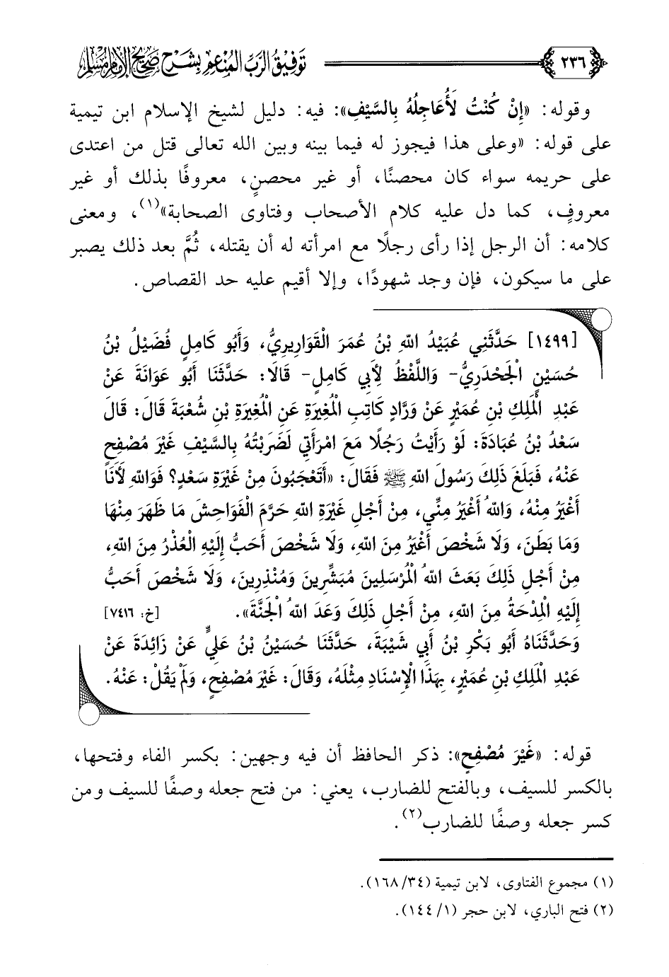 وقوله: ((إِنْ كُنْتُ لَأُعَاجِلُهُ بِالسَّيْفِ)) فيه: دليل لشيخ الإسلام ابن تيمية على قوله: - وعلى هذا فيجوز له فيما بينه وبين الله تعالى قتل من اعتدى على حريمه سواء كان محصناً أو غير محصنٍ معروفاً بذلك أو غير معروفٍ كما دل عليه كلام الأصحاب وفتاوى الصحابة-، ومعنى كلامه: أن الرجل إذا رأى رجلًا مع امرأته له أن يقتله، ثُمَّ بعد ذلك يصبر على ما سيكون، فإن وجد شهودًا، وإلا أقيم عليه حد القصاص (¬١).