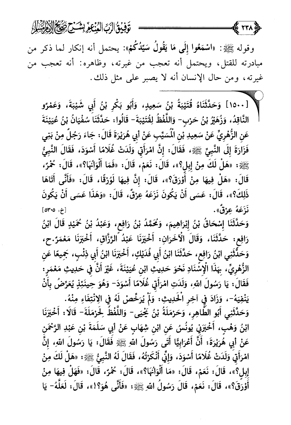 [١٥٠٠] وَحَدَّثَنَاهُ قُتَيْبَةُ بْنُ سَعِيدٍ، وَأَبُو بَكْرِ بْنُ أَبِي شَيْبَةَ، وَعَمْرٌو النَّاقِدُ، وَزُهَيْرُ بْنُ حَرْبٍ- وَاللَّفْظُ لِقُتَيْبَةَ- قَالُوا: حَدَّثَنَا سُفْيَانُ بْنُ عُيَيْنَةَ عَنِ الزُّهْرِيِّ عَنْ سَعِيدِ بْنِ الْمُسَيِّبِ عَنْ أبِي هُرَيْرَةَ قَالَ: جَاءَ رَجُلٌ مِنْ بَنِي فَزَارَةَ إِلَى النَّبِيِّ صلى الله عليه وسلم، فَقَالَ: إِنَّ امْرَأَتِي وَلَدَتْ غُلَامًا أَسْوَدَ، فَقَالَ النَّبِيُّ صلى الله عليه وسلم: ((هَلْ لَكَ مِنْ إِبِلٍ؟ ))، قَالَ: نَعَمْ، قَالَ: ((فَمَا أَلْوَانُهَا؟ ))، قَالَ: حُمْرٌ، قَالَ: ((هَلْ فِيهَا مِنْ أَوْرَقَ؟ ))، قَالَ: إِنَّ فِيهَا لَوُرْقًا، قَالَ: ((فَأَنَّى أَتَاهَا ذَلِكَ؟ ))، قَالَ: عَسَى أَنْ يَكُونَ نَزَعَهُ عِرْقٌ، قَالَ: ((وَهَذَا عَسَى أَنْ يَكُونَ نَزَعَهُ عِرْقٌ)).