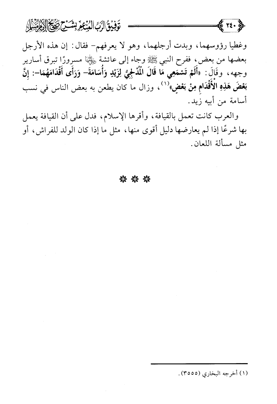 والعرب كانت تعمل بالقيافة، وأقرها الإسلام، فدل على أن القيافة يعمل بها شرعًا إذا لم يعارضها دليل أقوى منها، مثل ما إذا كان الولد للفراش، أو مثل مسألة اللعان.