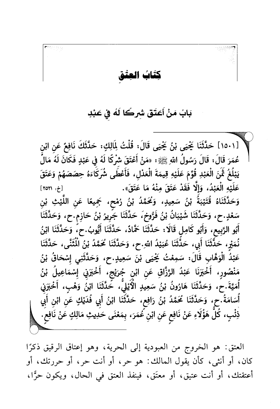 [١٥٠١] حَدَّثَنَا يَحْيَى بْنُ يَحْيَى قَالَ: قُلْتُ لِمَالِكٍ: حَدَّثَكَ نَافِعٌ عَنِ ابْنِ عُمَرَ قَالَ: قَالَ رَسُولُ اللهِ صلى الله عليه وسلم: ((مَنْ أَعْتَقَ شِرْكًا لَهُ فِي عَبْدٍ فَكَانَ لَهُ مَالٌ يَبْلُغُ ثَمَنَ الْعَبْدِ قُوِّمَ عَلَيْهِ قِيمَةَ الْعَدْلِ، فَأَعْطَى شُرَكَاءَهُ حِصَصَهُمْ وَعَتَقَ عَلَيْهِ الْعَبْدُ، وَإِلَّا فَقَدْ عَتَقَ مِنْهُ مَا عَتَقَ)).