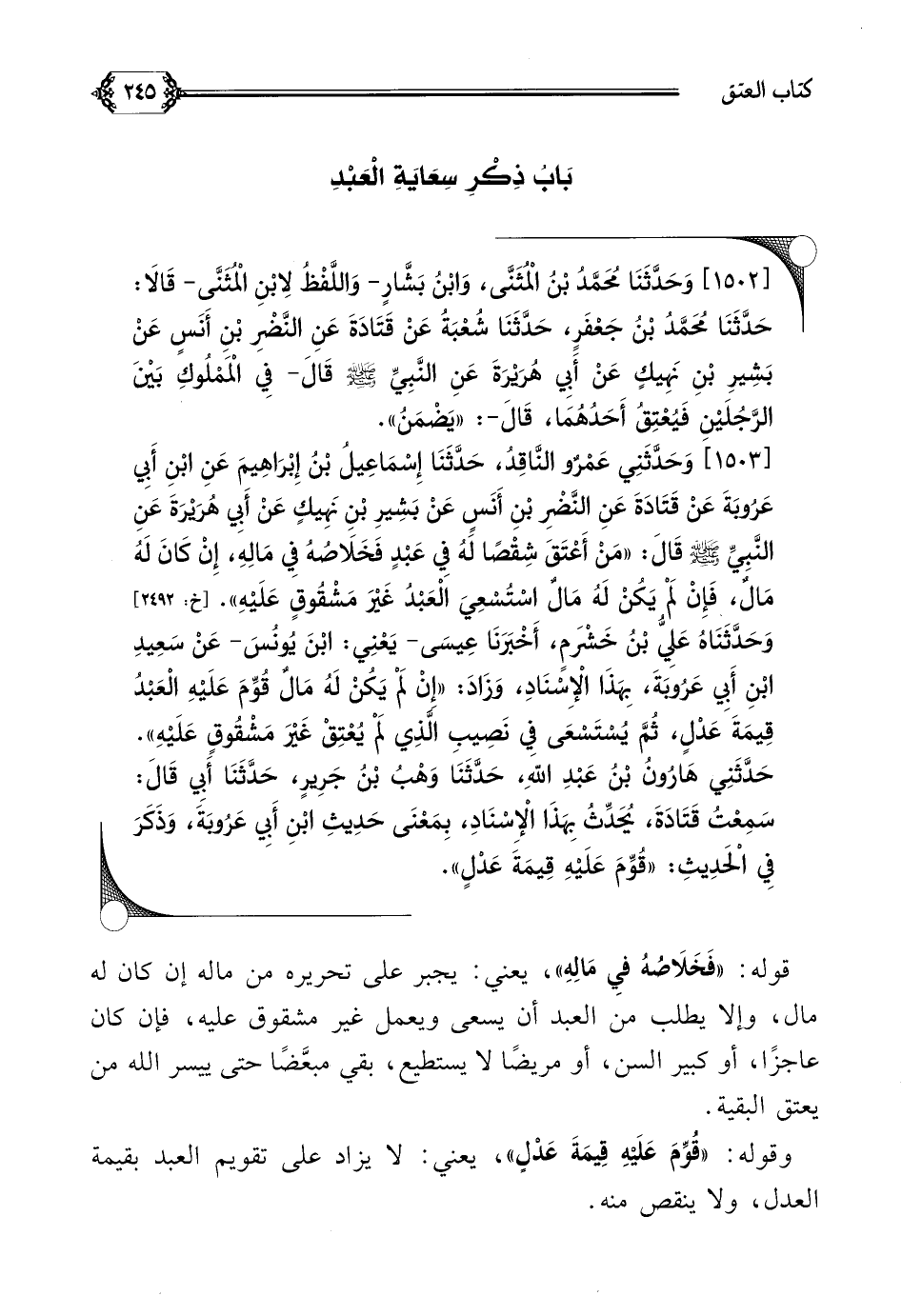 [١٥٠٢] وَحَدَّثَنَا مُحَمَّدُ بْنُ الْمُثَنَّى، وَابْنُ بَشَّارٍ- وَاللَّفْظُ لِابْنِ الْمُثَنَّى- قَالَا: حَدَّثَنَا مُحَمَّدُ بْنُ جَعْفَرٍ، حَدَّثَنَا شُعْبَةُ عَنْ قَتَادَةَ عَنِ النَّضْرِ بْنِ أَنَسٍ عَنْ بَشِيرِ بْنِ نَهِيكٍ عَنْ أَبِي هُرَيْرَةَ عَنِ النَّبِيِّ صلى الله عليه وسلم قَالَ- فِي الْمَمْلُوكِ بَيْنَ الرَّجُلَيْنِ فَيُعْتِقُ أَحَدُهُمَا، قَالَ-: ((يَضْمَنُ)).
