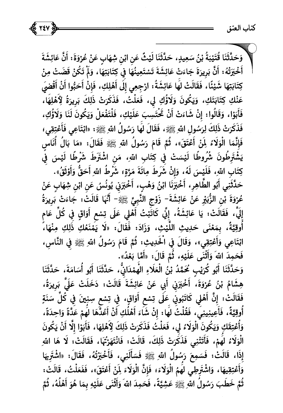 وَحَدَّثَنَا قُتَيْبَةُ بْنُ سَعِيدٍ، حَدَّثَنَا لَيْثٌ عَنِ ابْنِ شِهَابٍ عَنْ عُرْوَةَ: أَنَّ عَائِشَةَ أَخْبَرَتْهُ: أَنَّ بَرِيرَةَ جَاءَتْ عَائِشَةَ تَسْتَعِينُهَا فِي كِتَابَتِهَا، وَلَمْ تَكُنْ قَضَتْ مِنْ كِتَابَتِهَا شَيْئًا، فَقَالَتْ لَهَا عَائِشَةُ: ارْجِعِي إِلَى أَهْلِكِ، فَإِنْ أَحَبُّوا أَنْ أَقْضِيَ عَنْكِ كِتَابَتَكِ، وَيَكُونَ وَلَاؤُكِ لِي، فَعَلْتُ، فَذَكَرَتْ ذَلِكَ بَرِيرَةُ لِأَهْلِهَا، فَأَبَوْا، وَقَالُوا: إِنْ شَاءَتْ أَنْ تَحْتَسِبَ عَلَيْكِ، فَلْتَفْعَلْ وَيَكُونَ لَنَا وَلَاؤُكِ، فَذَكَرَتْ ذَلِكَ لِرَسُولِ اللهِ صلى الله عليه وسلم، فَقَالَ لَهَا رَسُولُ اللهِ صلى الله عليه وسلم: ((ابْتَاعِي فَأَعْتِقِي؛ فَإِنَّمَا الْوَلَاءُ لِمَنْ أَعْتَقَ))، ثُمَّ قَامَ رَسُولُ اللهِ صلى الله عليه وسلم فَقَالَ: ((مَا بَالُ أُنَاسٍ يَشْتَرِطُونَ شُرُوطًا لَيْسَتْ فِي كِتَابِ اللهِ، مَنِ اشْتَرَطَ شَرْطًا لَيْسَ فِي كِتَابِ اللهِ، فَلَيْسَ لَهُ، وَإِنْ شَرَطَ مِائَةَ مَرَّةٍ؛ شَرْطُ اللهِ أَحَقُّ وَأَوْثَقُ)).