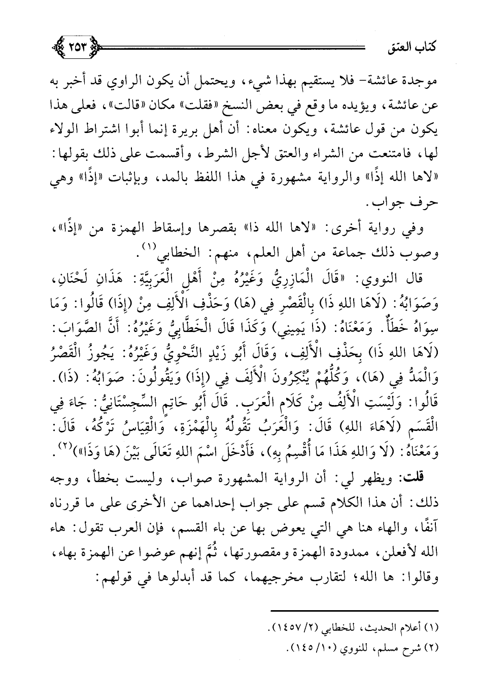 قال النووي: ((قَالَ الْمَازِرِيُّ وَغَيْرُهُ مِنْ أَهْلِ الْعَرَبِيَّةِ: هَذَانِ لَحْنَانِ، وَصَوَابُهُ: (لَاهَا اللهِ ذَا) بِالْقَصْرِ فِي (هَا) وَحَذْفِ الْأَلِفِ مِنْ (إِذَا) قَالُوا: وَمَا سِوَاهُ خَطَأٌ. وَمَعْنَاهُ: (ذَا يَمِينِي) وَكَذَا قَالَ الْخَطَّابِيُّ وَغَيْرُهُ: أَنَّ الصَّوَابَ: (لَاهَا اللهِ ذَا) بِحَذْفِ الْأَلِفِ، وَقَالَ أَبُو زَيْدٍ النَّحْوِيُّ وَغَيْرُهُ: يَجُوزُ الْقَصْرُ وَالْمَدُّ فِي (هَا)، وَكُلُّهُمْ يُنْكِرُونَ الْأَلِفَ فِي (إِذَا) وَيَقُولُونَ: صَوَابُهُ: (ذَا). قَالُوا: وَلَيْسَتِ الْأَلِفُ مِنْ كَلَامِ الْعَرَبِ. قَالَ أَبُو حَاتِمٍ السِّجِسْتَانِيُّ: جَاءَ فِي الْقَسَمِ (لَاهَاءَ اللهِ) قَالَ: وَالْعَرَبُ تَقُولُهُ بِالْهَمْزَةِ، وَالْقِيَاسُ تَرْكُهُ، قَالَ: وَمَعْنَاهُ: (لَا وَاللهِ هَذَا مَا أُقْسِمُ بِهِ)، فَأَدْخَلَ اسْمَ اللهِ تَعَالَى بَيْنَ (هَا وَذَا))). (¬٢)