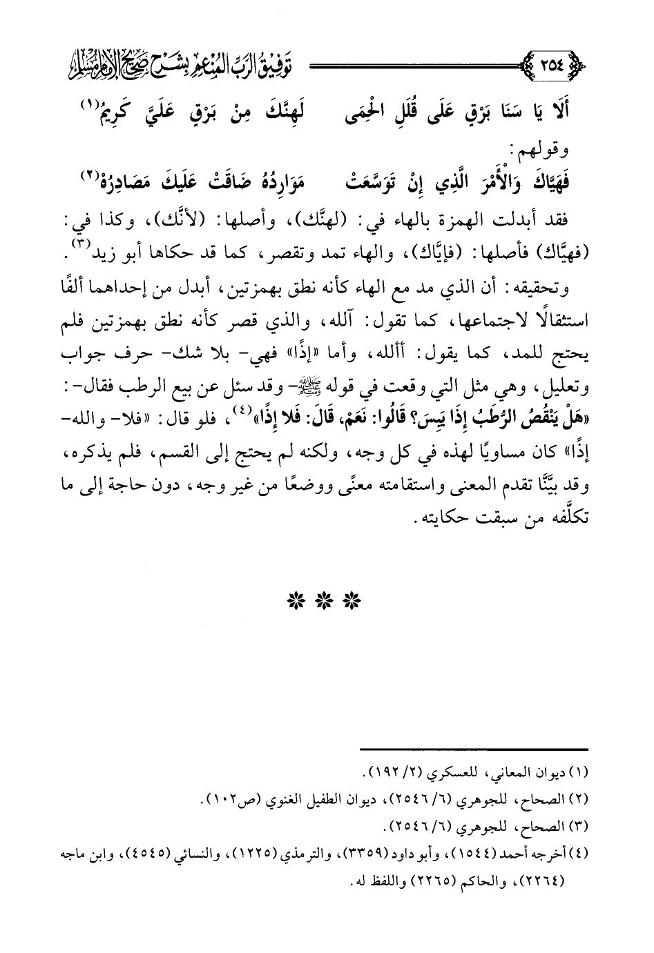 وتحقيقه: أن الذي مد مع الهاء كأنه نطق بهمزتين، أبدل من إحداهما ألفًا استثقالًا لاجتماعها، كما تقول: آلله، والذي قصر كأنه نطق بهمزتين فلم يحتج للمد، كما يقول: أألله، وأما ((إذًا)) فهي- بلا شك- حرف جواب وتعليل، وهي مثل التي وقعت في قوله صلى الله عليه وسلم- وقد سئل عن بيع الرطب فقال-: ((هَلْ يَنْقُصُ الرُّطَبُ إِذَا يَبِسَ؟ قَالُوا: نَعَمْ، قَالَ: فَلا إِذًا)) (¬٤)، فلو قال: ((فلا- والله- إذًا)) كان مساويًا لهذه في كل وجه، ولكنه لم يحتج إلى القسم، فلم يذكره، وقد بيَّنَّا تقدم المعنى واستقامته معنًى ووضعًا من غير وجه، دون حاجة إلى ما تكلَّفه من سبقت حكايته.