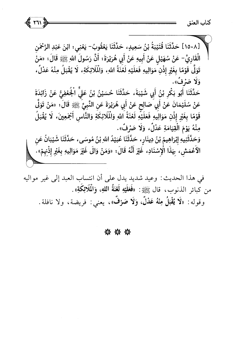 [١٥٠٨] حَدَّثَنَا قُتَيْبَةُ بْنُ سَعِيدٍ، حَدَّثَنَا يَعْقُوبُ- يَعْنِي: ابْنَ عَبْدِ الرَّحْمَنِ الْقَارِيَّ- عَنْ سُهَيْلٍ عَنْ أَبِيهِ عَنْ أَبِي هُرَيْرَةَ: أَنَّ رَسُولَ اللهِ صلى الله عليه وسلم قَالَ: ((مَنْ تَوَلَّى قَوْمًا بِغَيْرِ إِذْنِ مَوَالِيهِ فَعَلَيْهِ لَعْنَةُ اللهِ، وَالْمَلَائِكَةِ، لَا يُقْبَلُ مِنْهُ عَدْلٌ، وَلَا صَرْفٌ)).