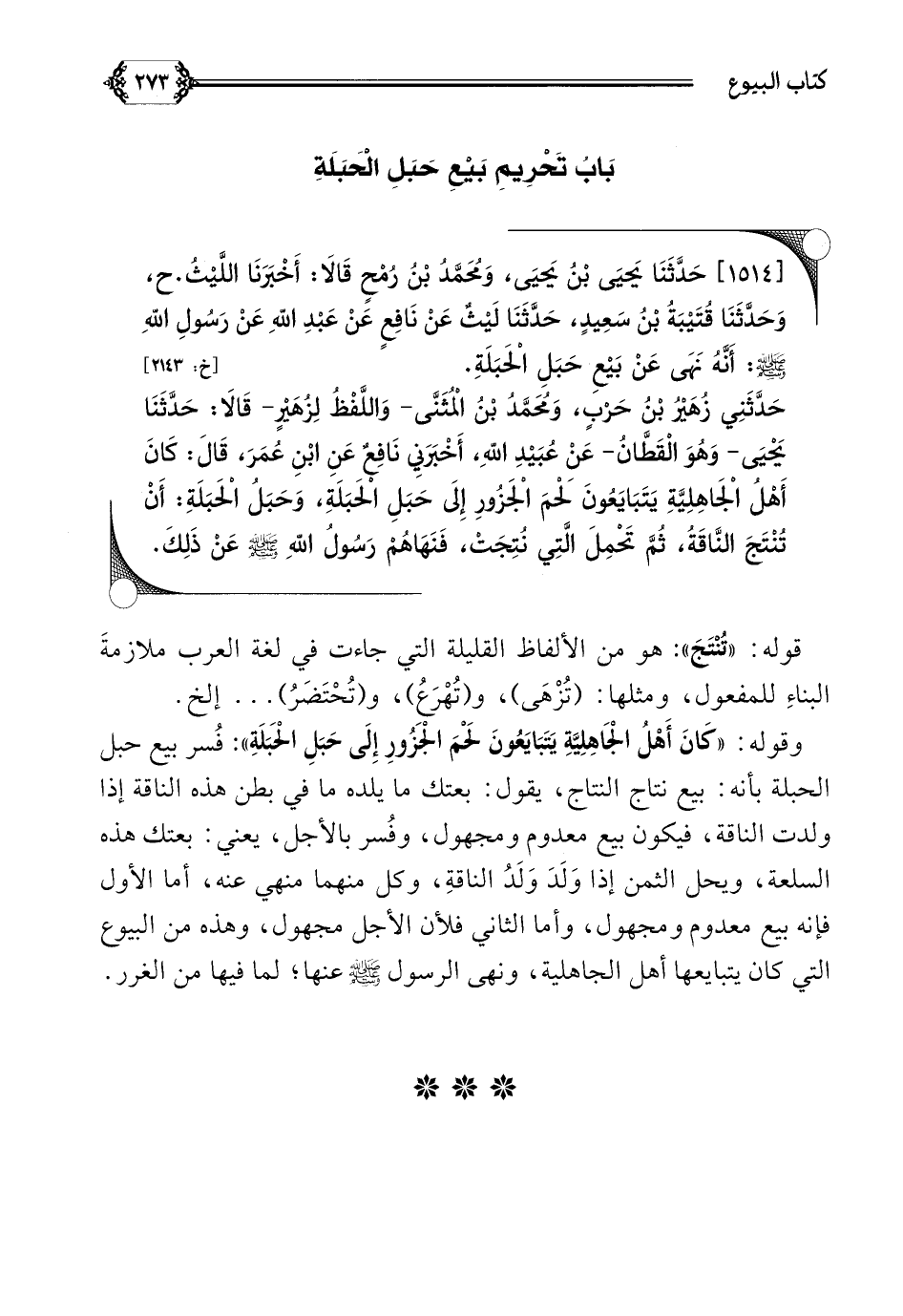 وقوله: ((كَانَ أَهْلُ الْجَاهِلِيَّةِ يَتَبَايَعُونَ لَحْمَ الْجَزُورِ إِلَى حَبَلِ الْحَبَلَةِ)): فُسر بيع حبل الحبلة بأنه: بيع نتاج النتاج، يقول: بعتك ما يلده ما في بطن هذه الناقة إذا ولدت الناقة، فيكون بيع معدوم ومجهول، وفسر بالأجل، يعني: بعتك هذه السلعة، ويحل الثمن إذا وَلَدَ وَلَدُ الناقةِ، وكل منهما منهي عنه، أما الأول فإنه بيع معدوم ومجهول، وأما الثاني فلأن الأجل مجهول، وهذه من البيوع التي كان يتبايعها أهل الجاهلية، ونهى الرسول صلى الله عليه وسلم عنها؛ لما فيها من الغرر.