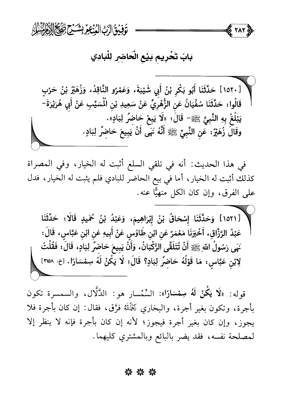 [١٥٢٠] حَدَّثَنَا أَبُو بَكْرِ بْنُ أَبِي شَيْبَةَ، وَعَمْرٌو النَّاقِدُ، وَزُهَيْرُ بْنُ حَرْبٍ قَالُوا: حَدَّثَنَا سُفْيَانُ عَنِ الزُّهْرِيِّ عَنْ سَعِيدِ بْنِ الْمُسَيِّبِ عَنْ أَبِي هُرَيْرَةَ- يَبْلُغُ بِهِ النَّبِيَّ صلى الله عليه وسلم- قَالَ: ((لَا يَبِعْ حَاضِرٌ لِبَادٍ)).