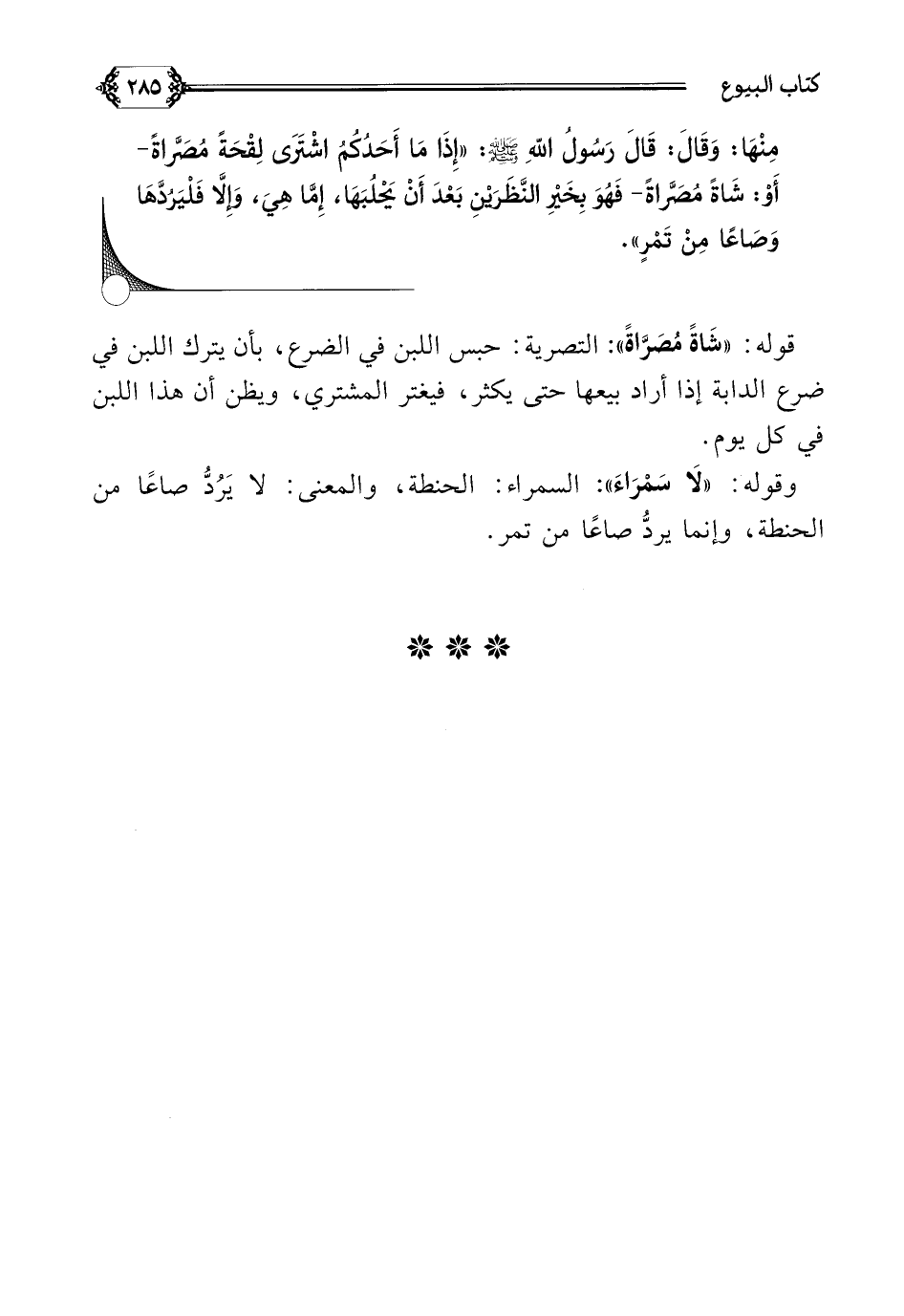 مِنْهَا: وَقَالَ: قَالَ رَسُولُ اللَّهِ صلى الله عليه وسلم: ((إِذَا مَا أَحَدُكُمُ اشْتَرَى لِقْحَةً مُصَرَّاةً- أَوْ: شَاةً مُصَرَّاةً- فَهُوَ بِخَيْرِ النَّظَرَيْنِ بَعْدَ أَنْ يَحْلُبَهَا، إِمَّا هِيَ، وَإِلَّا فَلْيَرُدَّهَا وَصَاعًا مِنْ تَمْرٍ)).