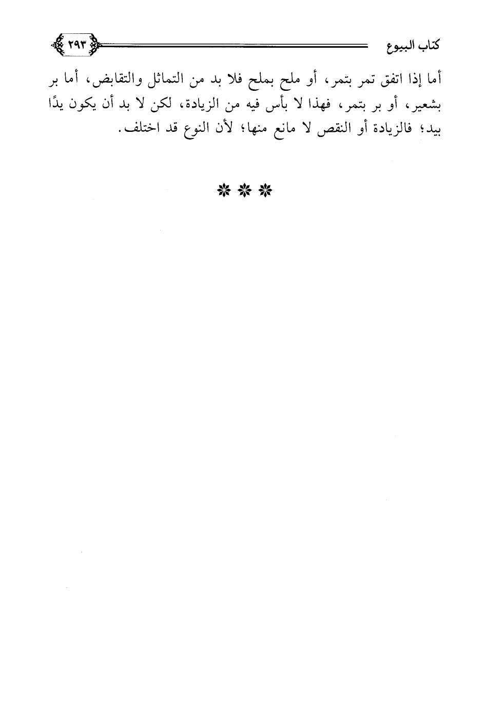 أما إذا اتفق تمر بتمر، أو ملح بملح فلا بد من التماثل والتقابض، أما بر بشعير، أو بر بتمر، فهذا لا بأس فيه من الزيادة، لكن لا بد أن يكون يدًا بيد؛ فالزيادة أو النقص لا مانع منها؛ لأن النوع قد اختلف.