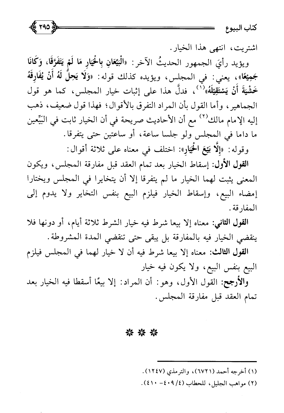 ويؤيد رأيَ الجمهور الحديثُ الآخر: ((الْبَيِّعَانِ بِالْخِيَارِ مَا لَمْ يَتَفَرَّقَا، وَكَانَا جَمِيْعًا))، يعني: في المجلس، ويؤيده كذلك قوله: ((وَلَا يَحِلُّ لَهُ أَنْ يُفَارِقَهُ خَشْيَةَ أَنْ يَسْتَقِيْلَهُ)) (¬١)، فدلَّ هذا على إثبات خيار المجلس، كما هو قول الجماهير، وأما القول بأن المراد التفرق بالأقوال؛ فهذا قول ضعيف، ذهب إليه الإمام مالك (¬٢) مع أن الأحاديث صريحة في أن الخيار ثابت في البَيِّعين ما داما في المجلس ولو جلسا ساعة، أو ساعتين حتى يتفرقا.