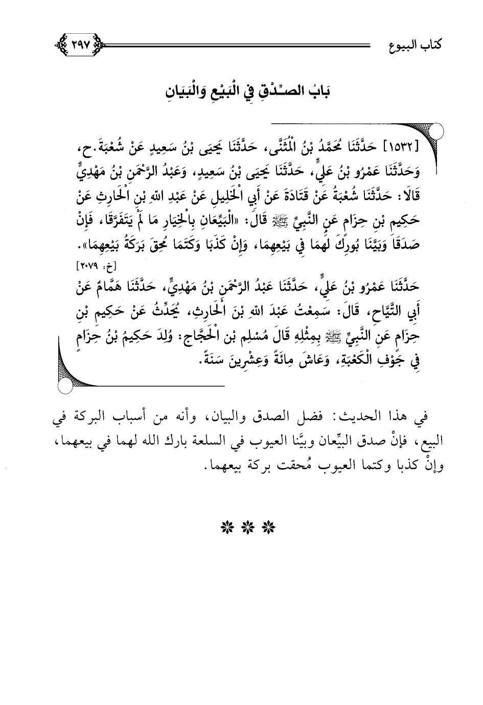 [١٥٣٢] حَدَّثَنَا مُحَمَّدُ بْنُ الْمُثَنَّى، حَدَّثَنَا يَحيَى بْنُ سَعِيدٍ عَنْ شُعْبَةَ. ح، وَحَدَّثَنَا عَمْرُو بْنُ عَلِيٍّ، حَدَّثَنَا يَحيَى بْنُ سَعِيدٍ، وَعَبْدُ الرَّحْمَنِ بْنُ مَهْدِيٍّ قَالَا: حَدَّثَنَا شُعْبَةُ عَنْ قَتَادَةَ عَنْ أَبِي الْخَلِيلِ عَنْ عَبْدِ اللَّهِ بْنِ الْحَارِثِ عَنْ حَكِيمِ بْنِ حِزَامٍ عَنِ النَّبِيِّ صلى الله عليه وسلم قَالَ: ((الْبَيِّعَانِ بِالْخِيَارِ مَا لَمْ يَتَفَرَّقَا، فَإِنْ صَدَقَا وَبَيَّنَا بُورِكَ لَهُمَا فِي بَيْعِهِمَا، وَإِنْ كَذَبَا وَكَتَمَا مُحِقَ بَرَكَةُ بَيْعِهِمَا)).