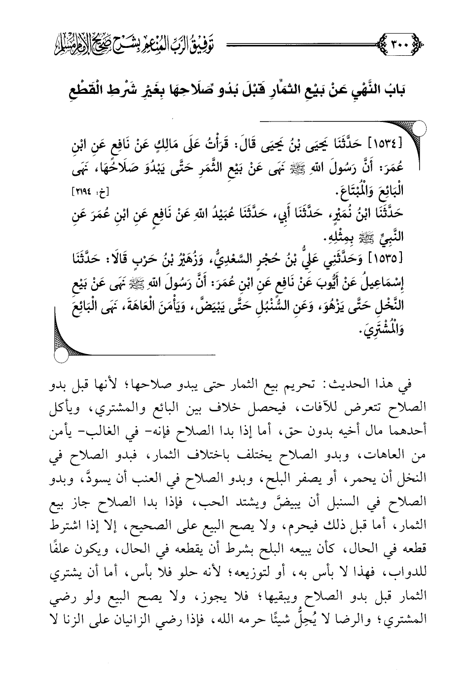 [١٥٣٤] حَدَّثَنَا يَحيَى بْنُ يَحيَى قَالَ: قَرَأْتُ عَلَى مَالِكٍ عَنْ نَافِعٍ عَنِ ابْنِ عُمَرَ: أَنَّ رَسُولَ اللَّهِ صلى الله عليه وسلم نَهَى عَنْ بَيْعِ الثَّمَرِ حَتَّى يَبْدُوَ صَلَاحُهَا، نَهَى الْبَائِعَ وَالْمُبْتَاعَ.