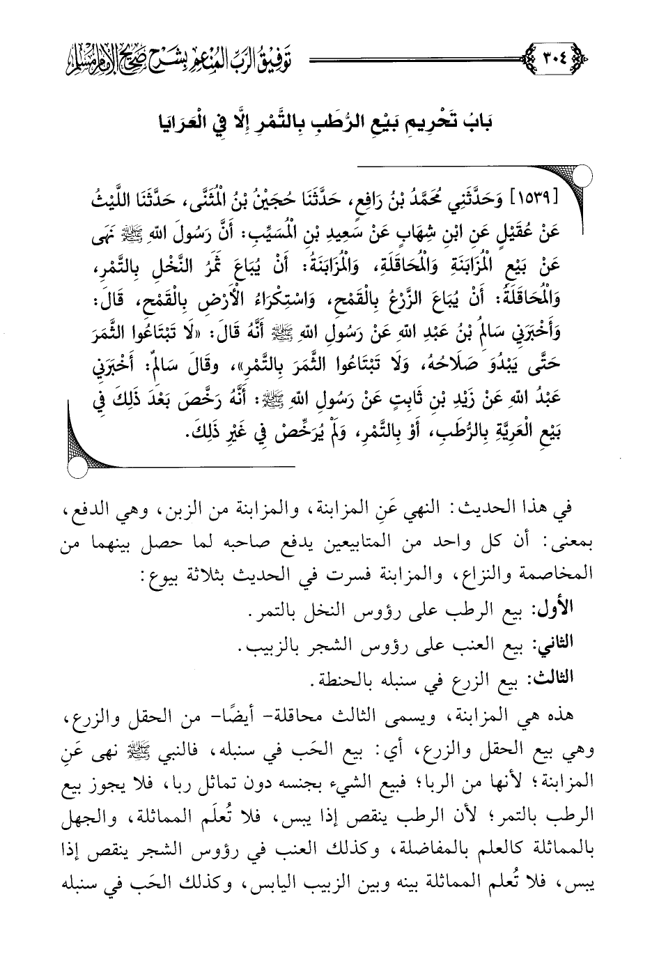 [١٥٣٩] وَحَدَّثَنِي مُحَمَّدُ بْنُ رَافِعٍ، حَدَّثَنَا حُجَيْنُ بْنُ الْمُثَنَّى، حَدَّثَنَا اللَّيْثُ عَنْ عُقَيْلٍ عَنِ ابْنِ شِهَابٍ عَنْ سَعِيدِ بْنِ الْمُسَيِّبِ: أَنَّ رَسُولَ اللَّهِ صلى الله عليه وسلم نَهَى عَنْ بَيْعِ الْمُزَابَنَةِ وَالْمُحَاقَلَةِ، وَالْمُزَابَنَةُ: أَنْ يُبَاعَ ثَمَرُ النَّخْلِ بِالتَّمْرِ، وَالْمُحَاقَلَةُ: أَنْ يُبَاعَ الزَّرْعُ بِالْقَمْحِ، وَاسْتِكْرَاءُ الْأَرْضِ بِالْقَمْحِ، قَالَ: وَأَخْبَرَنِي سَالِمُ بْنُ عَبْدِ اللَّهِ عَنْ رَسُولِ اللَّهِ صلى الله عليه وسلم أَنَّهُ قَالَ: ((لَا تَبْتَاعُوا الثَّمَرَ حَتَّى يَبْدُوَ صَلَاحُهُ، وَلَا تَبْتَاعُوا الثَّمَرَ بِالتَّمْرِ))، وقَالَ سَالِمٌ: أَخْبَرَنِي عَبْدُ اللَّهِ عَنْ زَيْدِ بْنِ ثَابِتٍ عَنْ رَسُولِ اللَّهِ صلى الله عليه وسلم: أَنَّهُ رَخَّصَ بَعْدَ ذَلِكَ فِي بَيْعِ الْعَرِيَّةِ بِالرُّطَبِ، أَوْ بِالتَّمْرِ، وَلَمْ يُرَخِّصْ فِي غَيْرِ ذَلِكَ.