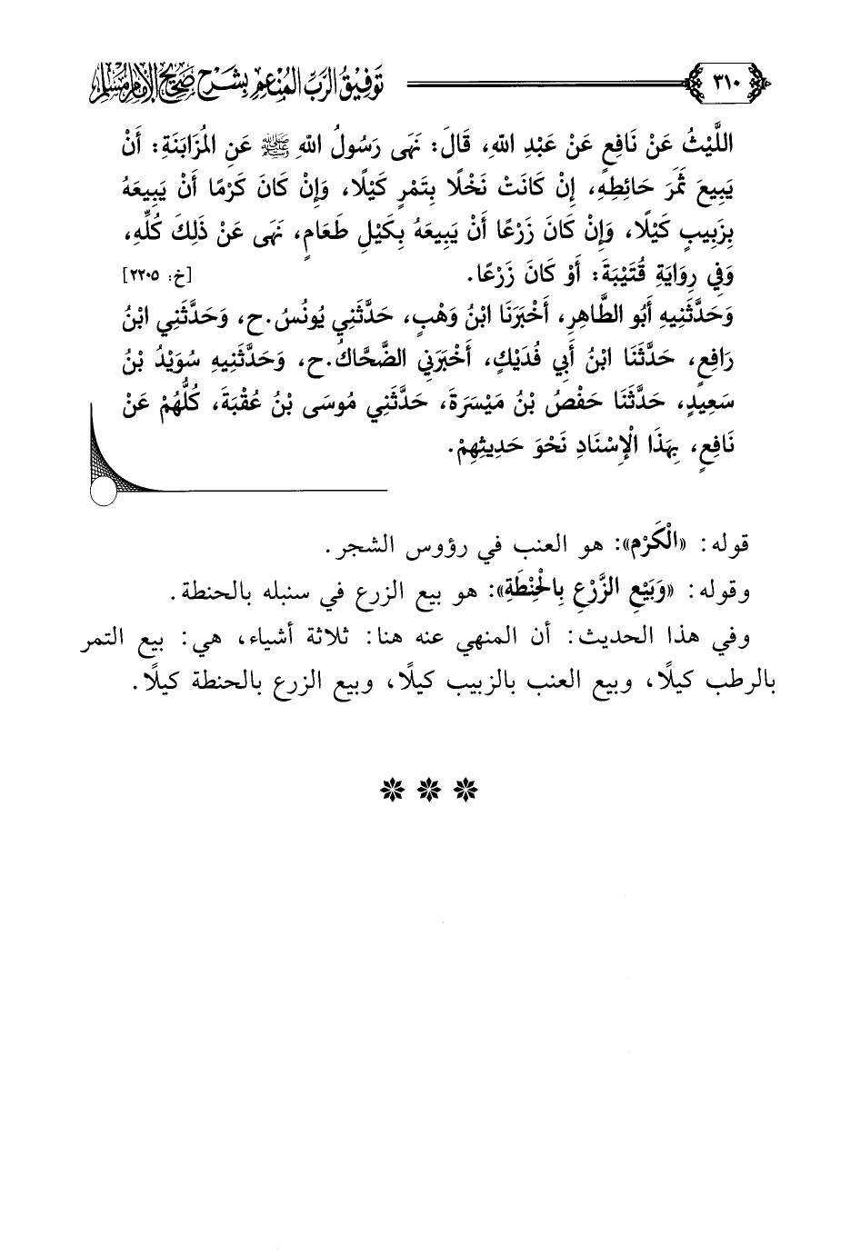 اللَّيْثُ عَنْ نَافِعٍ عَنْ عَبْدِ اللَّهِ، قَالَ: نَهَى رَسُولُ اللَّهِ صلى الله عليه وسلم عَنِ المُزَابَنَةِ: أَنْ يَبِيعَ ثَمَرَ حَائِطِهِ، إِنْ كَانَتْ نَخْلًا بِتَمْرٍ كَيْلًا، وَإِنْ كَانَ كَرْمًا أَنْ يَبِيعَهُ بِزَبِيبٍ كَيْلًا، وَإِنْ كَانَ زَرْعًا أَنْ يَبِيعَهُ بِكَيْلِ طَعَامٍ، نَهَى عَنْ ذَلِكَ كُلِّهِ، وَفِي رِوَايَةِ قُتَيْبَةَ: أَوْ كَانَ زَرْعًا.