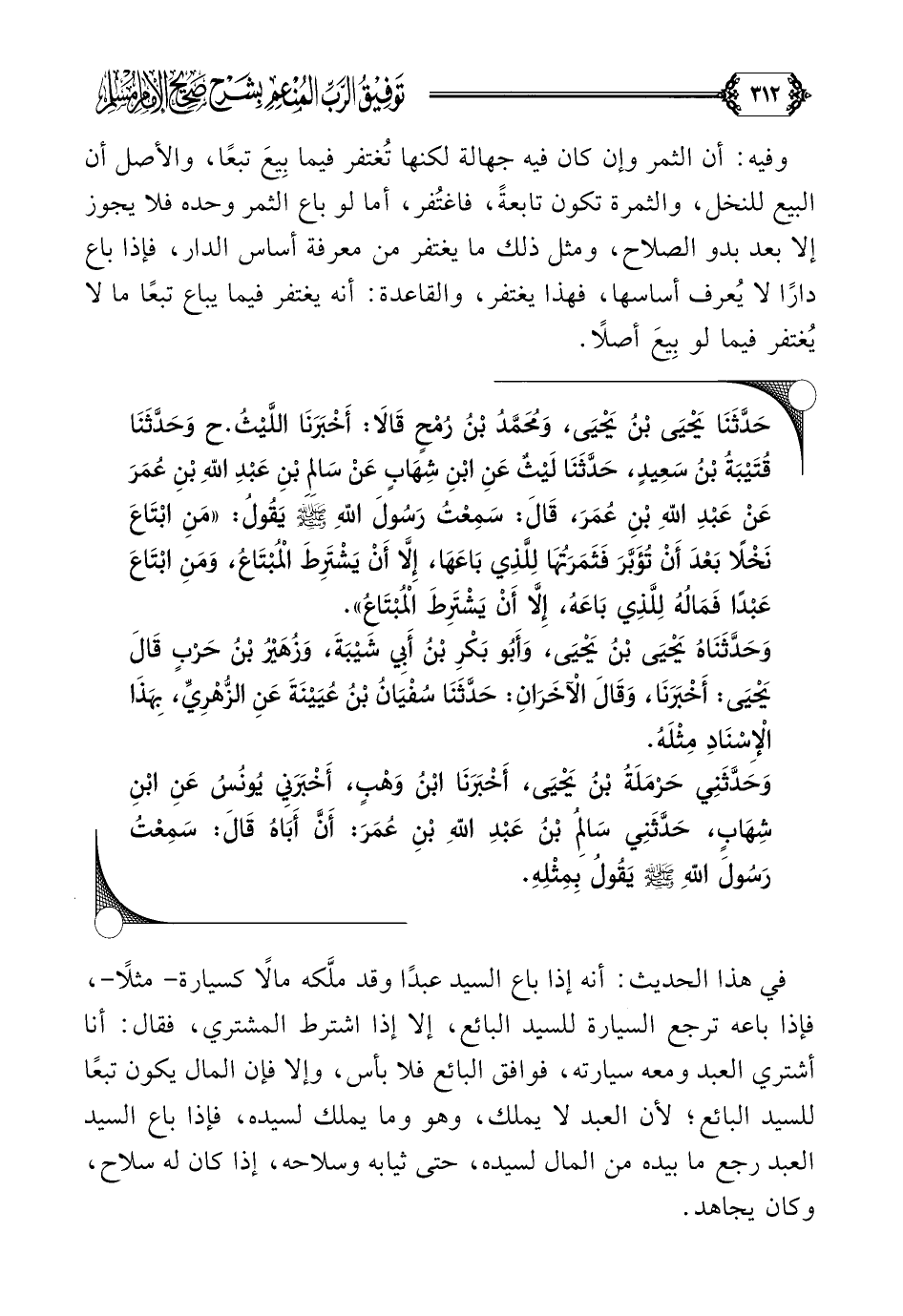 حَدَّثَنَا يَحْيَى بْنُ يَحْيَى، وَمُحَمَّدُ بْنُ رُمْحٍ قَالَا: أَخْبَرَنَا اللَّيْثُ. ح وَحَدَّثَنَا قُتَيْبَةُ بْنُ سَعِيدٍ، حَدَّثَنَا لَيْثٌ عَنِ ابْنِ شِهَابٍ عَنْ سَالِمِ بْنِ عَبْدِ اللَّهِ بْنِ عُمَرَ عَنْ عَبْدِ اللَّهِ بْنِ عُمَرَ، قَالَ: سَمِعْتُ رَسُولَ اللَّهِ صلى الله عليه وسلم يَقُولُ: ((مَنِ ابْتَاعَ نَخْلًا بَعْدَ أَنْ تُؤَبَّرَ فَثَمَرَتُهَا لِلَّذِي بَاعَهَا، إِلَّا أَنْ يَشْتَرِطَ الْمُبْتَاعُ، وَمَنِ ابْتَاعَ عَبْدًا فَمَالُهُ لِلَّذِي بَاعَهُ، إِلَّا أَنْ يَشْتَرِطَ الْمُبْتَاعُ)).