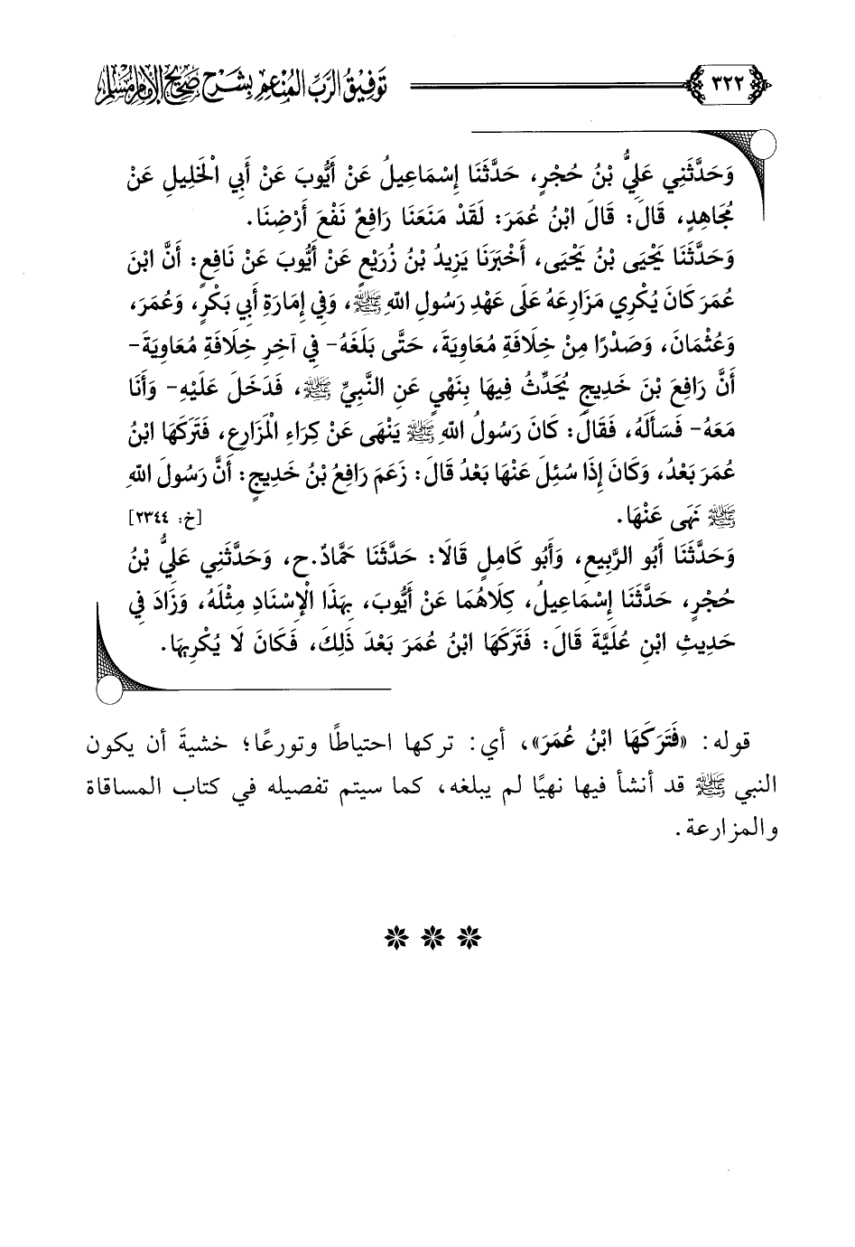 وَحَدَّثَنِي عَلِيُّ بْنُ حُجْرٍ، حَدَّثَنَا إِسْمَاعِيلُ عَنْ أَيُّوبَ عَنْ أَبِي الْخَلِيلِ عَنْ مُجَاهِدٍ، قَالَ: قَالَ ابْنُ عُمَرَ: لَقَدْ مَنَعَنَا رَافِعٌ نَفْعَ أَرْضِنَا.