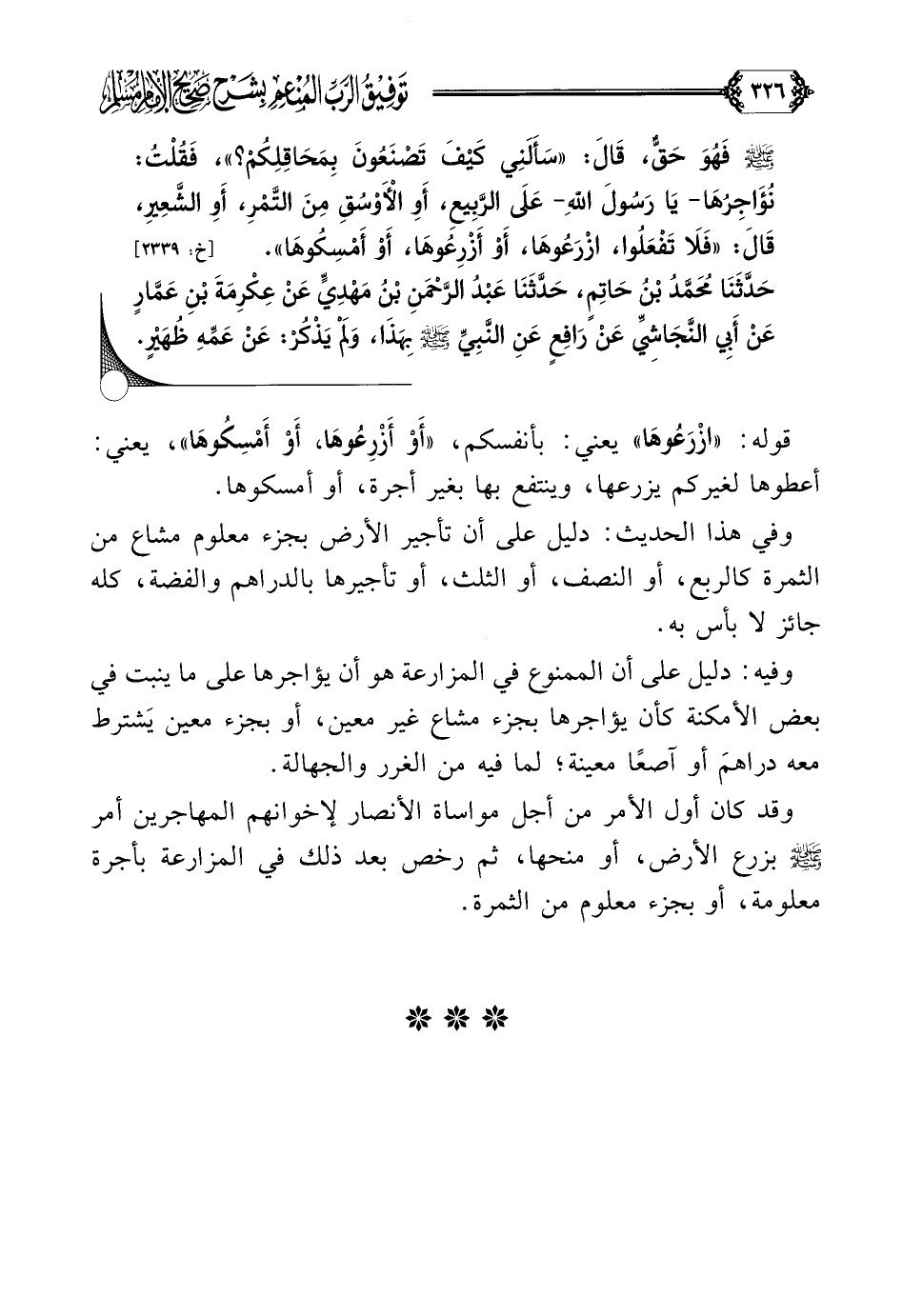وفيه: دليل على أن الممنوع في المزارعة هو أن يؤاجرها على ما ينبت في بعض الأمكنة كأن يؤاجرها بجزء مشاع غير معين، أو بجزء معين يَشترط معه دراهمَ أو آصعًا معينة؛ لما فيه من الغرر والجهالة.