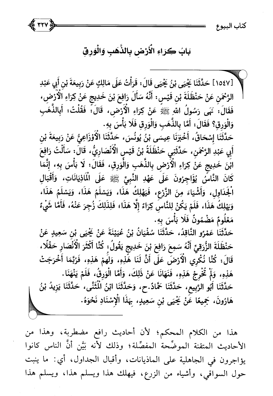 [١٥٤٧] حَدَّثَنَا يَحْيَى بْنُ يَحْيَى قَالَ: قَرَأْتُ عَلَى مَالِكٍ عَنْ رَبِيعَةَ بْنِ أَبِي عَبْدِ الرَّحْمَنِ عَنْ حَنْظَلَةَ بْنِ قَيْسٍ: أَنَّهُ سَأَلَ رَافِعَ بْنَ خَدِيجٍ عَنْ كِرَاءِ الْأَرْضِ، فَقَالَ: نَهَى رَسُولُ اللَّهِ صلى الله عليه وسلم عَنْ كِرَاءِ الْأَرْضِ، قَالَ: فَقُلْتُ: أَبِالذَّهَبِ وَالْوَرِقِ؟ فَقَالَ: أَمَّا بِالذَّهَبِ وَالْوَرِقِ فَلَا بَأْسَ بِهِ.
