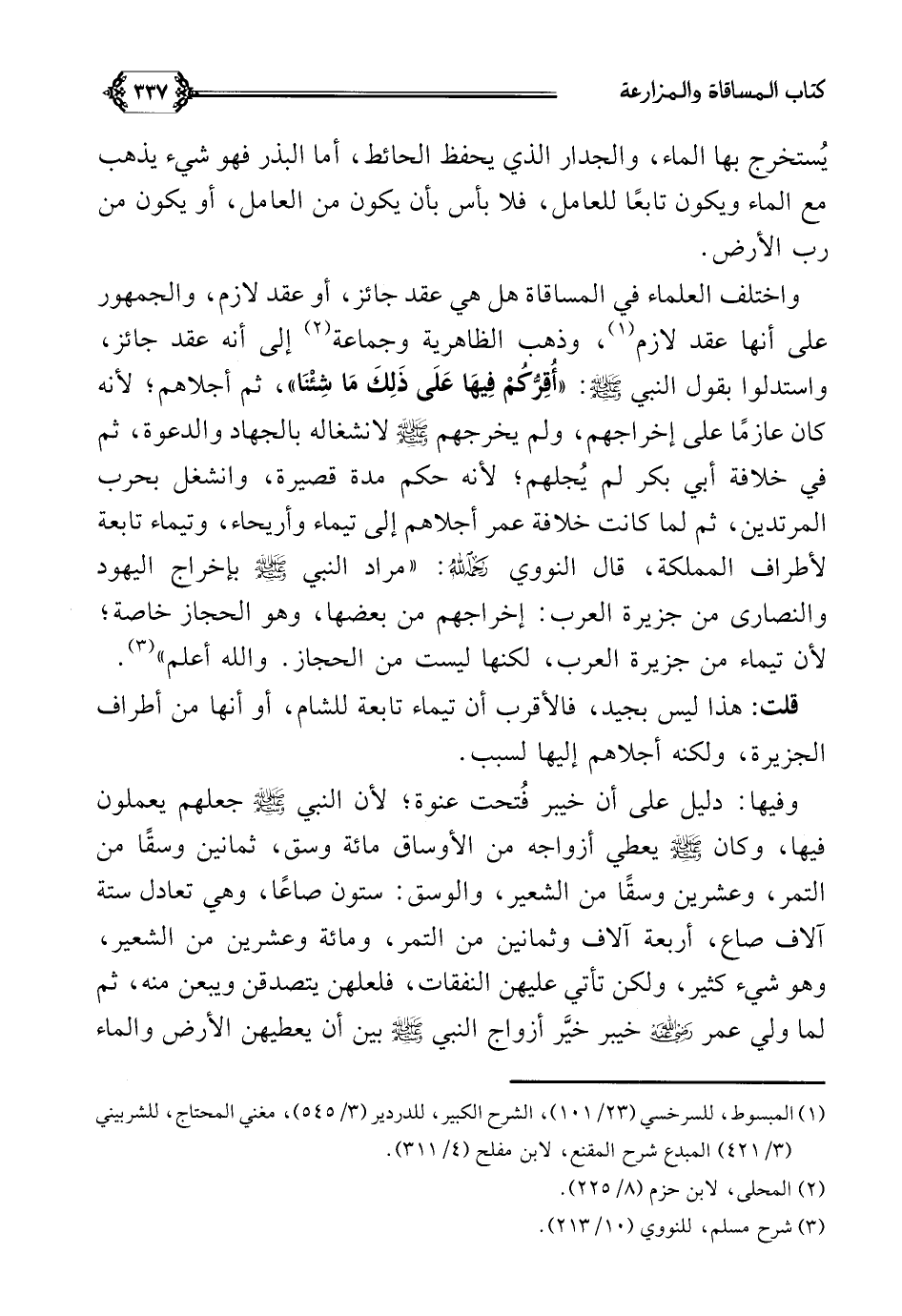 واختلف العلماء في المساقاة هل هي عقد جائز، أو عقد لازم، والجمهور على أنها عقد لازم (¬١)، وذهب الظاهرية وجماعة (¬٢) إلى أنه عقد جائز، واستدلوا بقول النبي صلى الله عليه وسلم: ((أُقِرُّكُمْ فِيهَا عَلَى ذَلِكَ مَا شِئْنَا))، ثم أجلاهم؛ لأنه كان عازمًا على إخراجهم، ولم يخرجهم عليه الصلاة والسلام لانشغاله بالجهاد والدعوة، ثم في خلافة أبي بكر لم يُجلهم؛ لأنه حكم مدة قصيرة، وانشغل بحرب المرتدين، ثم لما كانت خلافة عمر أجلاهم إلى تيماء وأريحاء، وتيماء تابعة لأطراف المملكة، قال النووي رحمه الله: ((مراد النبي صلى الله عليه وسلم بإخراج اليهود والنصارى من جزيرة العرب: إخراجهم من بعضها، وهو الحجاز خاصة؛ لأن تيماء من جزيرة العرب، لكنها ليست من الحجاز. والله أعلم)) (¬٣)، قلت: هذا ليس بجيد، فالأقرب أن تيماء تابعة للشام، أو أنها من أطراف الجزيرة، ولكنه أجلاهم إليها لسبب.