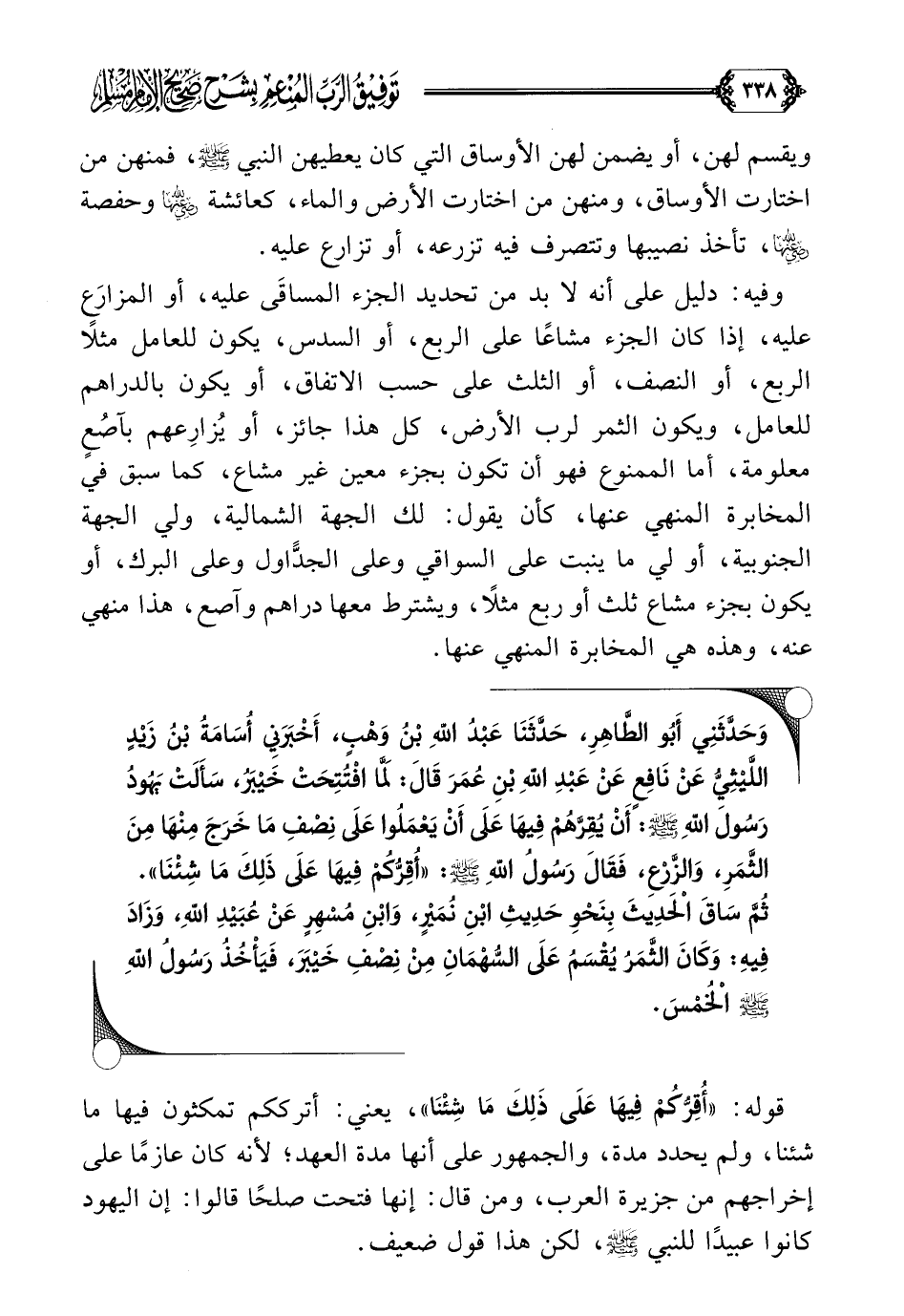 وفيه: دليل على أنه لا بد من تحديد الجزء المساقَى عليه، أو المزارَع عليه، إذا كان الجزء مشاعًا على الربع، أو السدس، يكون للعامل مثلًا الربع، أو النصف، أو الثلث على حسب الاتفاق، أو يكون بالدراهم للعامل، ويكون الثمر لرب الأرض، كل هذا جائز، أو يُزارِعهم بآصُعٍ معلومة، أما الممنوع فهو أن تكون بجزء معين غير مشاع، كما سبق في المخابرة المنهي عنها، كأن يقول: لك الجهة الشمالية، ولي الجهة الجنوبية، أو لي ما ينبت على السواقي وعلى الجداول وعلى البرك، أو يكون بجزء مشاع ثلث أو ربع مثلًا، ويشترط معها دراهم وآصع، هذا منهي عنه، وهذه هي المخابرة المنهي عنها.