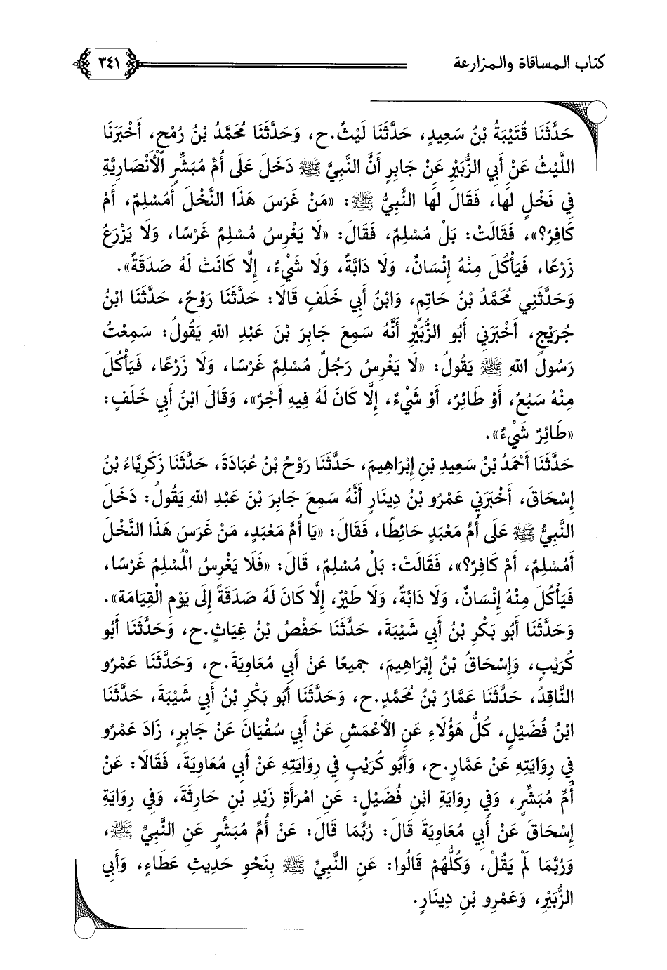 حَدَّثَنَا أَحْمَدُ بْنُ سَعِيدِ بْنِ إِبْرَاهِيمَ، حَدَّثَنَا رَوْحُ بْنُ عُبَادَةَ، حَدَّثَنَا زَكَرِيَّاءُ بْنُ إِسْحَاقَ، أَخْبَرَنِي عَمْرُو بْنُ دِينَارٍ أَنَّهُ سَمِعَ جَابِرَ بْنَ عَبْدِ اللَّهِ يَقُولُ: دَخَلَ النَّبِيُّ صلى الله عليه وسلم عَلَى أُمِّ مَعْبَدٍ حَائِطًا، فَقَالَ: ((يَا أُمَّ مَعْبَدٍ، مَنْ غَرَسَ هَذَا النَّخْلَ أَمُسْلِمٌ، أَمْ كَافِرٌ؟ ))، فَقَالَتْ: بَلْ مُسْلِمٌ، قَالَ: ((فَلَا يَغْرِسُ الْمُسْلِمُ غَرْسًا، فَيَأْكُلَ مِنْهُ إِنْسَانٌ، وَلَا دَابَّةٌ، وَلَا طَيْرٌ، إِلَّا كَانَ لَهُ صَدَقَةً إِلَى يَوْمِ الْقِيَامَة)).
