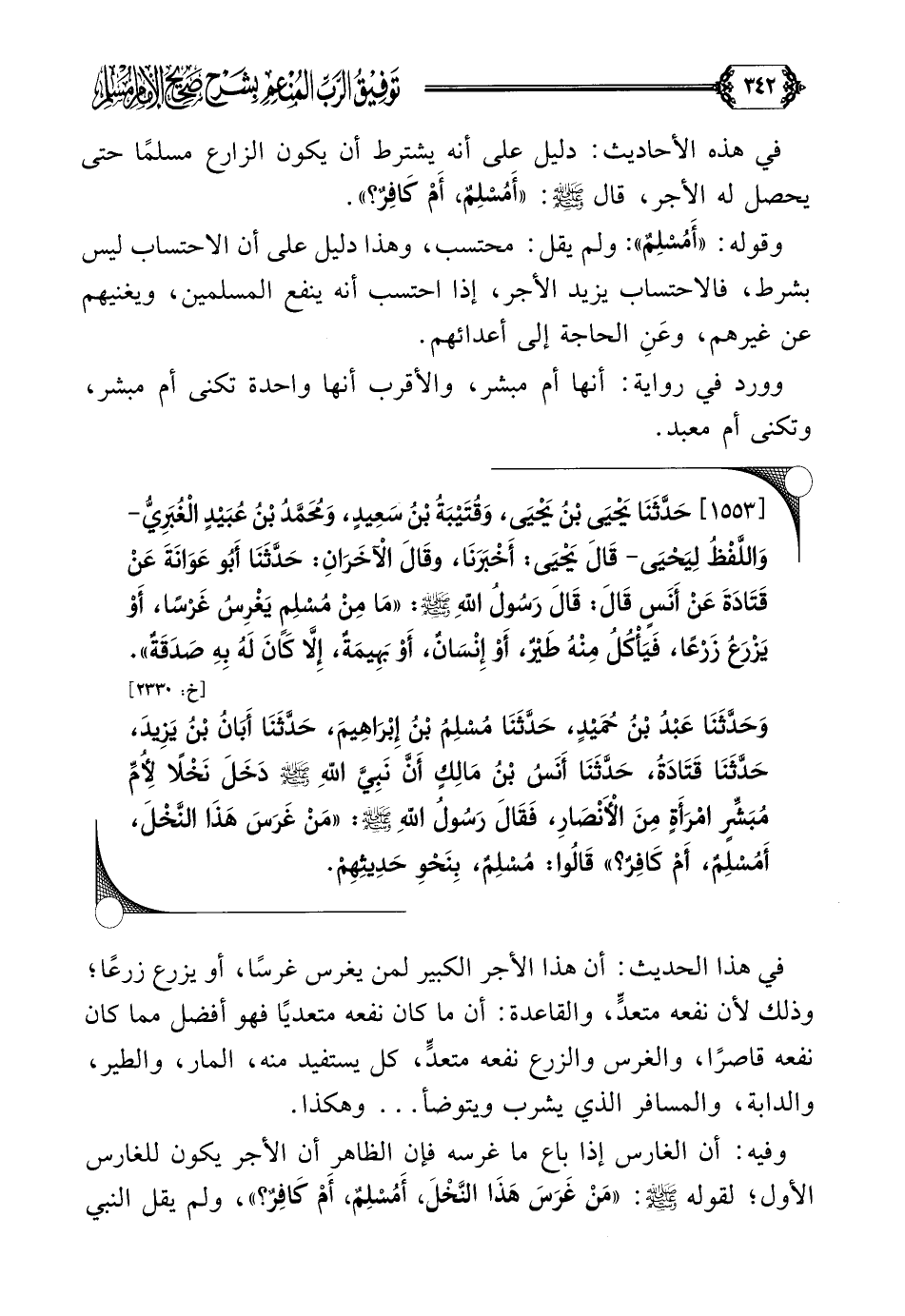[١٥٥٣] حَدَّثَنَا يَحْيَى بْنُ يَحْيَى، وَقُتَيْبَةُ بْنُ سَعِيدٍ، وَمُحَمَّدُ بْنُ عُبَيْدٍ الْغُبَرِيُّ- وَاللَّفْظُ لِيَحْيَى- قَالَ يَحْيَى: أَخْبَرَنَا، وقَالَ الْآخَرَانِ: حَدَّثَنَا أَبُو عَوَانَةَ عَنْ قَتَادَةَ عَنْ أَنَسٍ قَالَ: قَالَ رَسُولُ اللَّهِ صلى الله عليه وسلم: ((مَا مِنْ مُسْلِمٍ يَغْرِسُ غَرْسًا، أَوْ يَزْرَعُ زَرْعًا، فَيَأْكُلُ مِنْهُ طَيْرٌ، أَوْ إِنْسَانٌ، أَوْ بَهِيمَةٌ، إِلَّا كَانَ لَهُ بِهِ صَدَقَةٌ)).