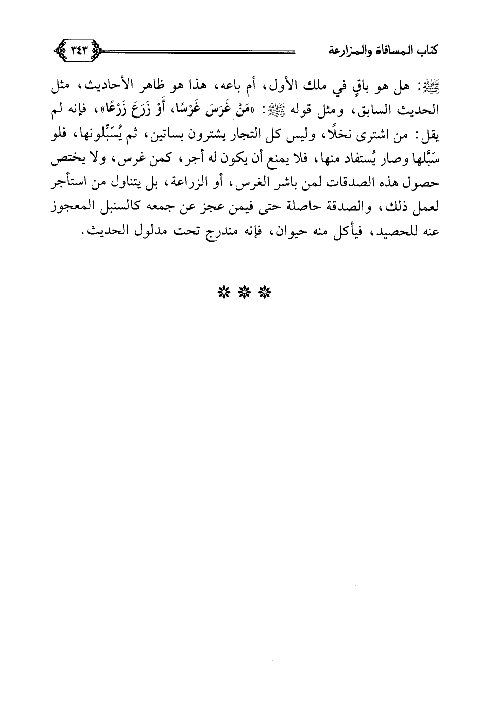 صلى الله عليه وسلم: هل هو باقٍ في ملك الأول، أم باعه، هذا هو ظاهر الأحاديث، مثل الحديث السابق، ومثل قوله صلى الله عليه وسلم: ((مَنْ غَرَسَ غَرْسًا، أَوْ زَرَعَ زَرْعًا))، فإنه لم يقل: من اشترى نخلًا، وليس كل التجار يشترون بساتين، ثم يُسَبِّلونها، فلو سَبَّلها وصار يُستفاد منها، فلا يمنع أن يكون له أجر، كمن غرس، ولا يختص حصول هذه الصدقات لمن باشر الغرس، أو الزراعة، بل يتناول من استأجر لعمل ذلك، والصدقة حاصلة حتى فيمن عجز عن جمعه كالسنبل المعجوز عنه للحصيد، فيأكل منه حيوان، فإنه مندرج تحت مدلول الحديث.