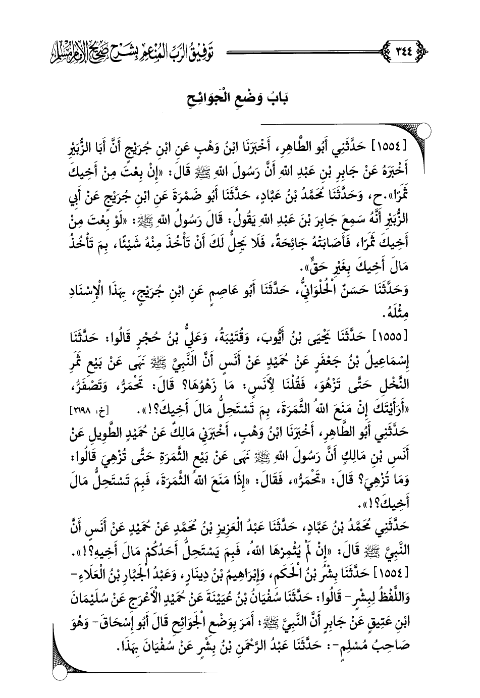 [١٥٥٤] حَدَّثَنِي أَبُو الطَّاهِرِ، أَخْبَرَنَا ابْنُ وَهْبٍ عَنِ ابْنِ جُرَيْجٍ أَنَّ أَبَا الزُّبَيْرِ أَخْبَرَهُ عَنْ جَابِرِ بْنِ عَبْدِ اللَّهِ أَنَّ رَسُولَ اللَّهِ صلى الله عليه وسلم قَالَ: ((إِنْ بِعْتَ مِنْ أَخِيكَ ثَمَرًا)). ح، وَحَدَّثَنَا مُحَمَّدُ بْنُ عَبَّادٍ، حَدَّثَنَا أَبُو ضَمْرَةَ عَنِ ابْنِ جُرَيْجٍ عَنْ أَبِي الزُّبَيْرِ أَنَّهُ سَمِعَ جَابِرَ بْنَ عَبْدِ اللَّهِ يَقُولُ: قَالَ رَسُولُ اللَّهِ صلى الله عليه وسلم: ((لَوْ بِعْتَ مِنْ أَخِيكَ ثَمَرًا، فَأَصَابَتْهُ جَائِحَةٌ، فَلَا يَحِلُّ لَكَ أَنْ تَأْخُذَ مِنْهُ شَيْئًا، بِمَ تَأْخُذُ مَالَ أَخِيكَ بِغَيْرِ حَقٍّ)).