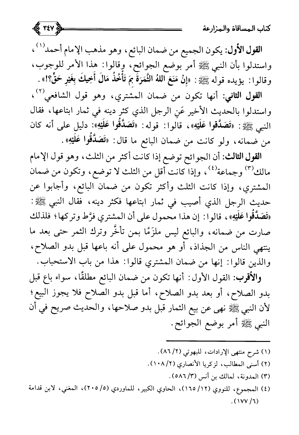 القول الثاني: أنها تكون من ضمان المشتري، وهو قول الشافعي (¬٢)، واستدلوا بالحديث الأخير عَنِ الرجل الذي كثر دينه في ثمار ابتاعها، فقال النبي صلى الله عليه وسلم: ((تَصَدَّقوا عَلَيْهِ))، قالوا: قوله: ((تَصَدَّقُوا عَلَيْهِ)): دليل على أنه كان من ضمانه، ولو كانت من ضمان البائع ما قال: ((تَصَدَّقُوا عَلَيْهِ)).