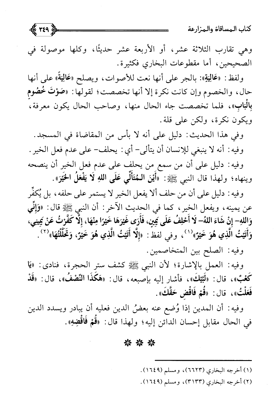 وفيه: العمل بالإشارة؛ لأن النبي صلى الله عليه وسلم كشف ستر الحجرة، فنادى: ((يَا كَعْبٌ))، قال: ((لَبَّيْكَ))، فأشار إليه بإصبعه، قال: ((هَكَذَا النِّصْفُ))، قال: ((قَدْ فَعَلْتُ))، قال: ((قُمْ فَاقْضِ حَقَّكَ)).