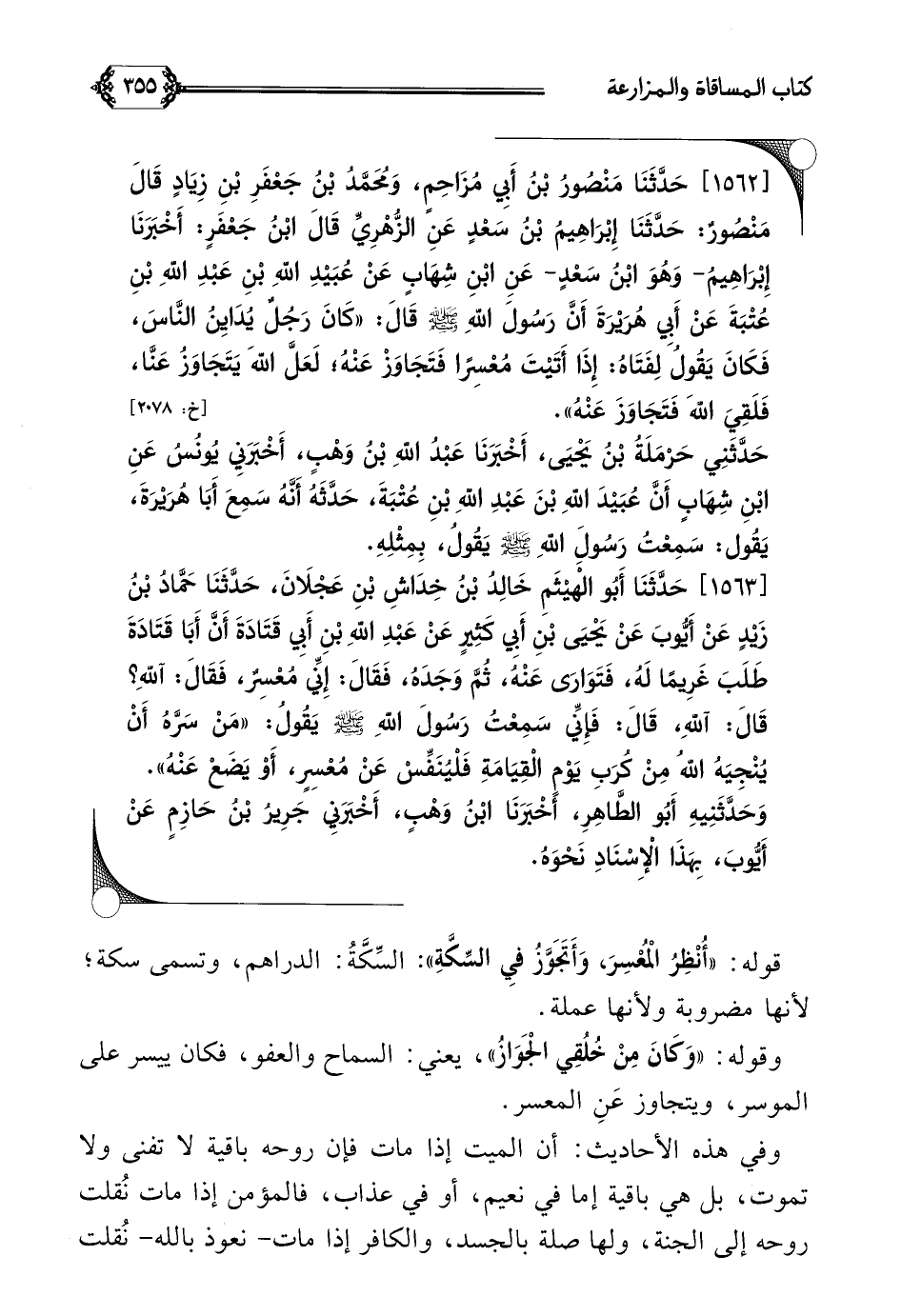 [١٥٦٢] حَدَّثَنَا مَنْصُورُ بْنُ أَبِي مُزَاحِمٍ، وَمُحَمَّدُ بْنُ جَعْفَرِ بْنِ زِيَادٍ قَالَ مَنْصُورٌ: حَدَّثَنَا إِبْرَاهِيمُ بْنُ سَعْدٍ عَنِ الزُّهْرِيِّ قَالَ ابْنُ جَعْفَرٍ: أَخْبَرَنَا إِبْرَاهِيمُ- وَهُوَ ابْنُ سَعْدٍ- عَنِ ابْنِ شِهَابٍ عَنْ عُبَيْدِ اللَّهِ بْنِ عَبْدِ اللَّهِ بْنِ عُتْبَةَ عَنْ أَبِي هُرَيْرَةَ أَنَّ رَسُولَ اللَّهِ صلى الله عليه وسلم قَالَ: ((كَانَ رَجُلٌ يُدَايِنُ النَّاسَ، فَكَانَ يَقُولُ لِفَتَاهُ: إِذَا أَتَيْتَ مُعْسِرًا فَتَجَاوَزْ عَنْهُ؛ لَعَلَّ اللَّهَ يَتَجَاوَزُ عَنَّا، فَلَقِيَ اللَّهَ فَتَجَاوَزَ عَنْهُ)).