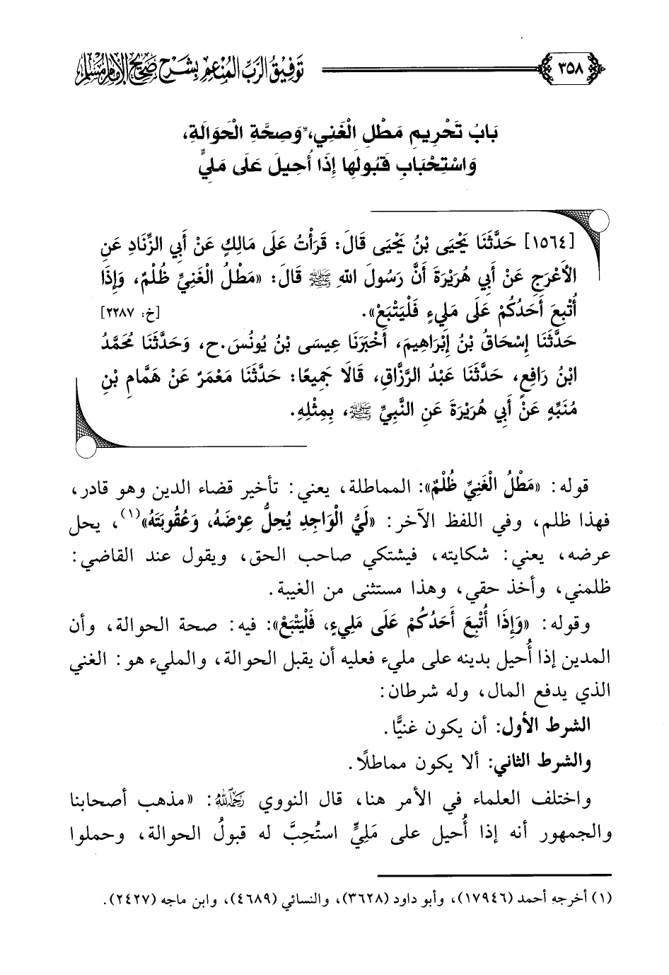 [١٥٦٤] حَدَّثَنَا يَحْيَى بْنُ يَحْيَى قَالَ: قَرَأْتُ عَلَى مَالِكٍ عَنْ أَبِي الزِّنَادِ عَنِ الأَعْرَجِ عَنْ أَبِي هُرَيْرَةَ أَنَّ رَسُولَ اللَّهِ صلى الله عليه وسلم قَالَ: ((مَطْلُ الْغَنِيِّ ظُلْمٌ، وَإِذَا أُتْبِعَ أَحَدُكُمْ عَلَى مَلِيءٍ فَلْيَتْبَعْ)).