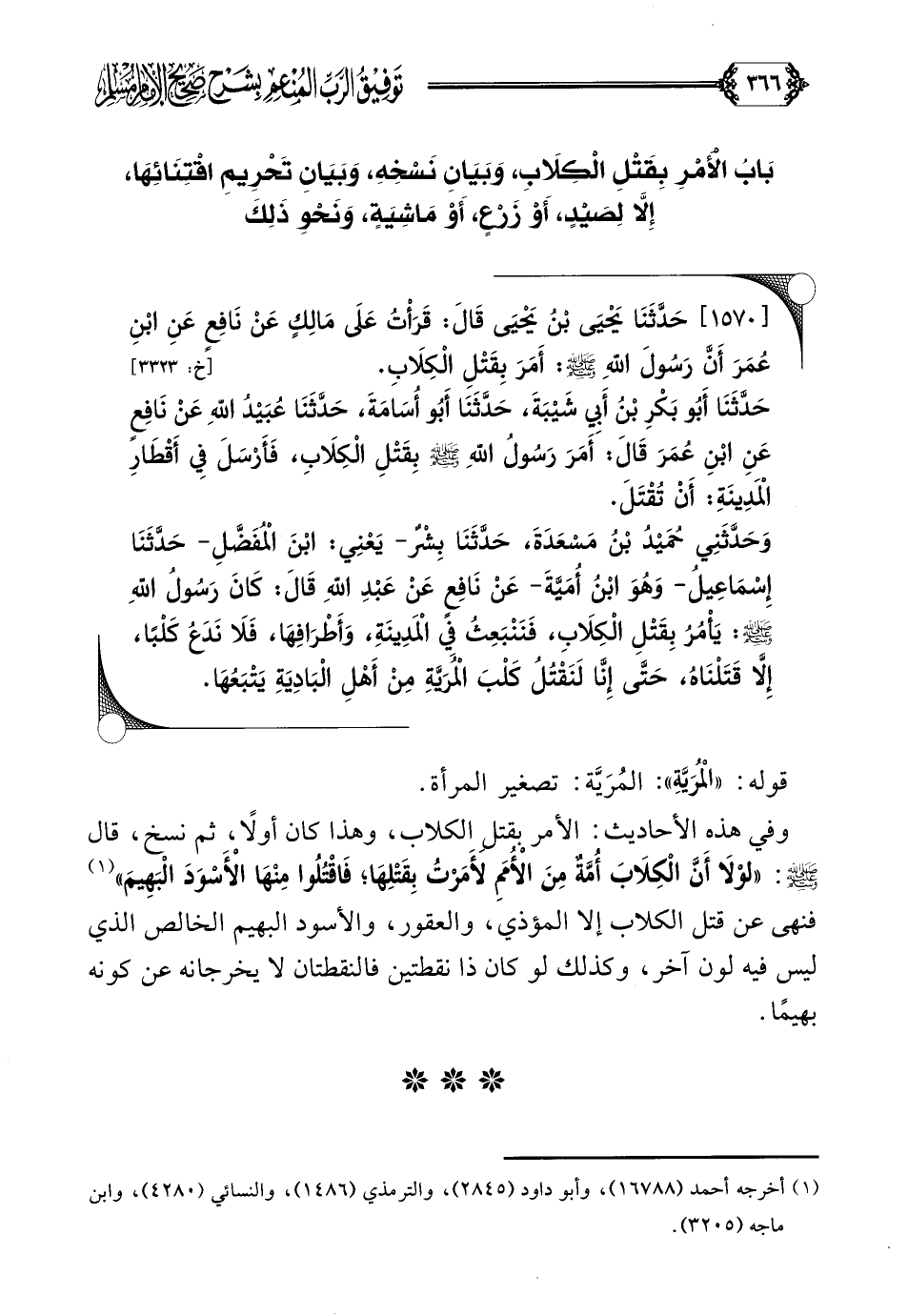[١٥٧٠] حَدَّثَنَا يَحْيَى بْنُ يَحْيَى قَالَ: قَرَأْتُ عَلَى مَالِكٍ عَنْ نَافِعٍ عَنِ ابْنِ عُمَرَ أَنَّ رَسُولَ اللَّهِ صلى الله عليه وسلم: أَمَرَ بِقَتْلِ الْكِلَابِ.