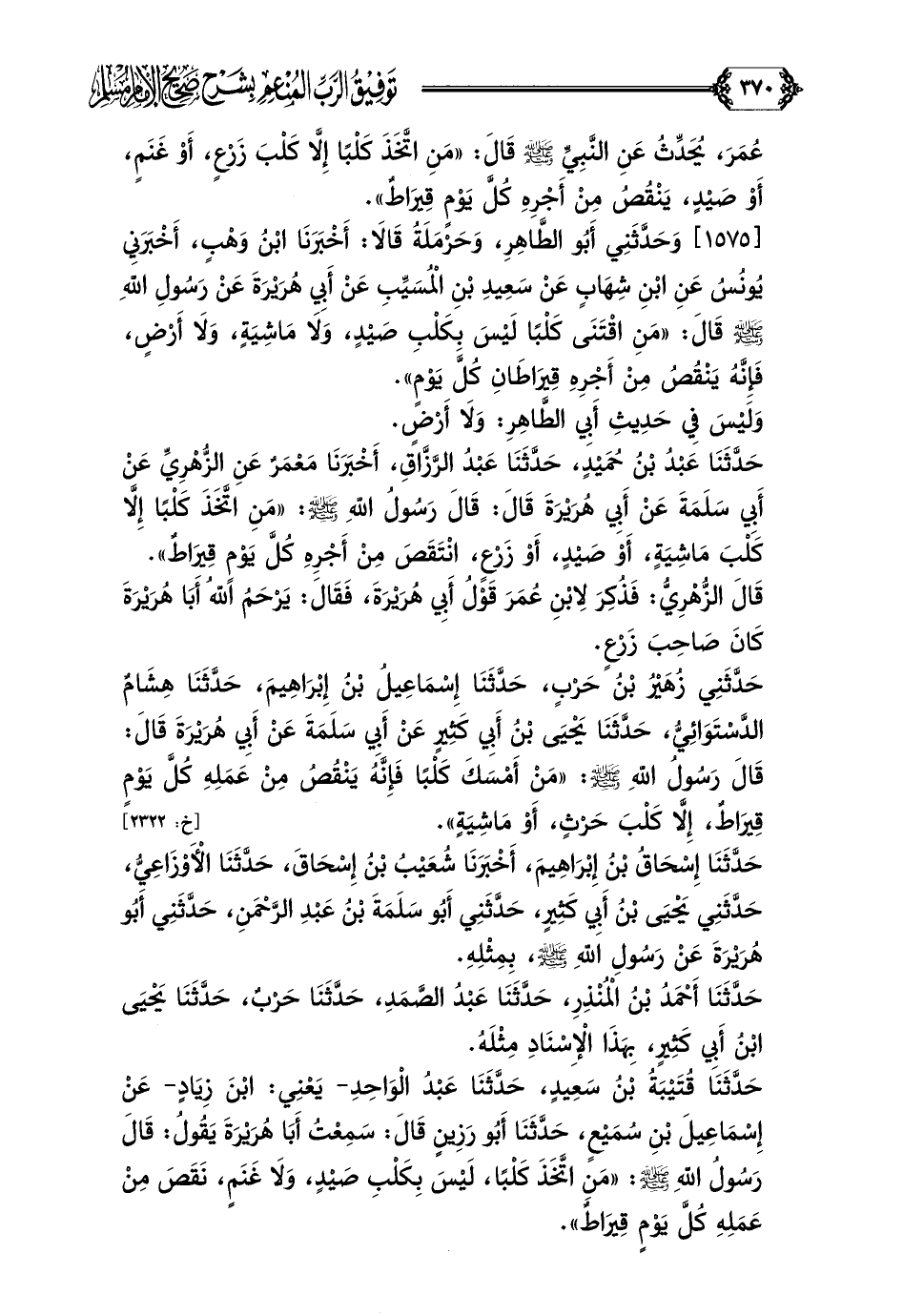 حَدَّثَنِي زُهَيْرُ بْنُ حَرْبٍ، حَدَّثَنَا إِسْمَاعِيلُ بْنُ إِبْرَاهِيمَ، حَدَّثَنَا هِشَامٌ الدَّسْتَوَائِيُّ، حَدَّثَنَا يَحْيَى بْنُ أَبِي كَثِيرٍ عَنْ أَبِي سَلَمَةَ عَنْ أَبِي هُرَيْرَةَ قَالَ: قَالَ رَسُولُ اللَّهِ صلى الله عليه وسلم: ((مَنْ أَمْسَكَ كَلْبًا فَإِنَّهُ يَنْقُصُ مِنْ عَمَلِهِ كُلَّ يَوْمٍ قِيرَاطٌ، إِلَّا كَلْبَ حَرْثٍ، أَوْ مَاشِيَةٍ)).