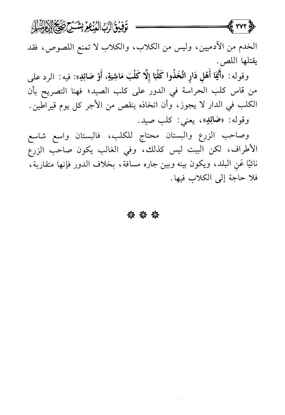 وصاحب الزرع والبستان محتاج للكلب، فالبستان واسع شاسع الأطراف، لكن البيت ليس كذلك، وفي الغالب يكون صاحب الزرع نائيًا عَنِ البلد، ويكون بينه وبين جاره مسافة، بخلاف الدور فإنها متقاربة، فلا حاجة إلى الكلاب فيها.