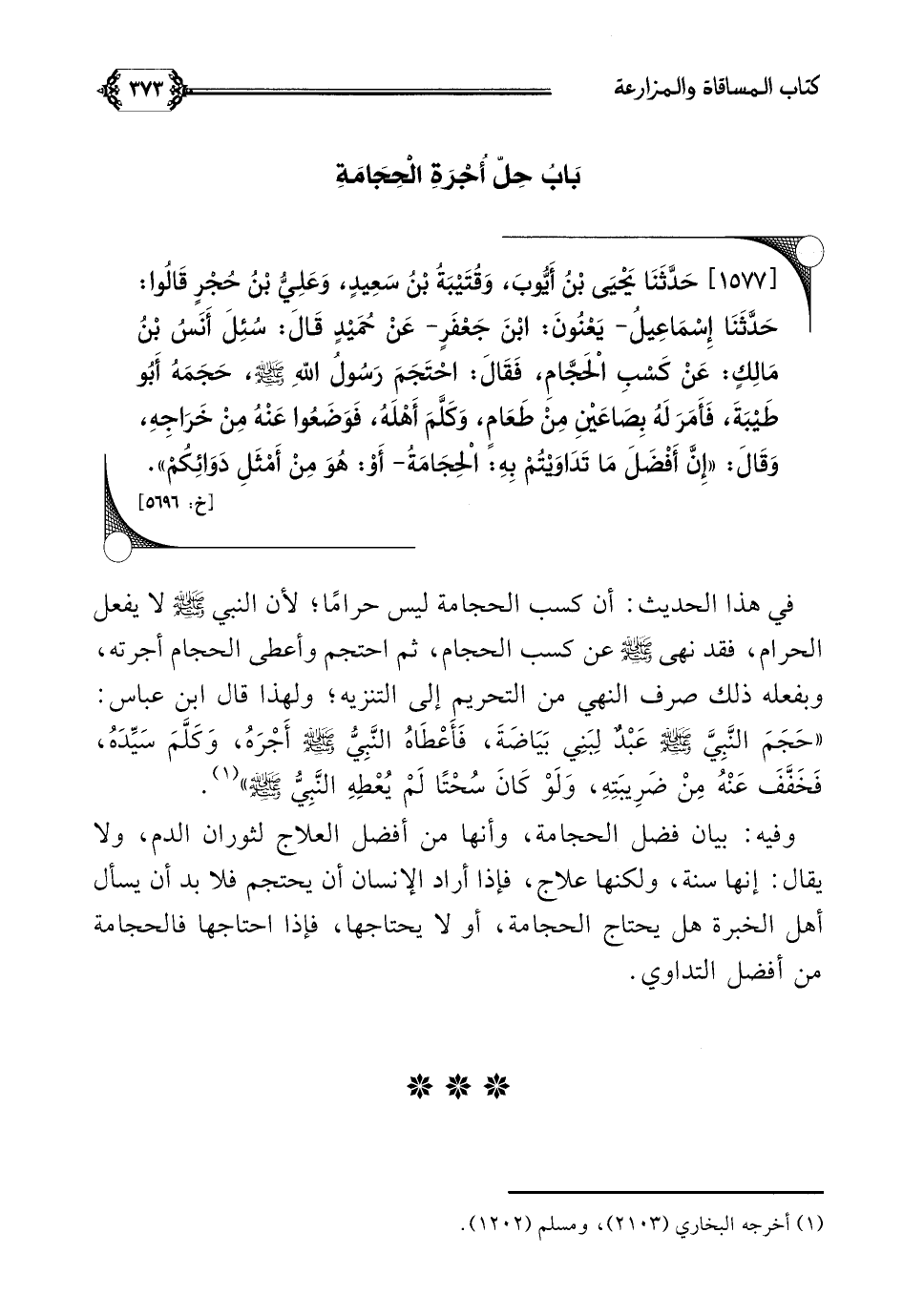 [١٥٧٧] حَدَّثَنَا يَحْيَى بْنُ أَيُّوبَ، وَقُتَيْبَةُ بْنُ سَعِيدٍ، وَعَلِيُّ بْنُ حُجْرٍ قَالُوا: حَدَّثَنَا إِسْمَاعِيلُ- يَعْنُونَ: ابْنَ جَعْفَرٍ- عَنْ حُمَيْدٍ قَالَ: سُئِلَ أَنَسُ بْنُ مَالِكٍ: عَنْ كَسْبِ الْحَجَّامِ، فَقَالَ: احْتَجَمَ رَسُولُ اللَّهِ صلى الله عليه وسلم، حَجَمَهُ أَبُو طَيْبَةَ، فَأَمَرَ لَهُ بِصَاعَيْنِ مِنْ طَعَامٍ، وَكَلَّمَ أَهْلَهُ، فَوَضَعُوا عَنْهُ مِنْ خَرَاجِهِ، وَقَالَ: ((إِنَّ أَفْضَلَ مَا تَدَاوَيْتُمْ بِهِ: الْحِجَامَةُ- أَوْ: هُوَ مِنْ أَمْثَلِ دَوَائِكُمْ)).