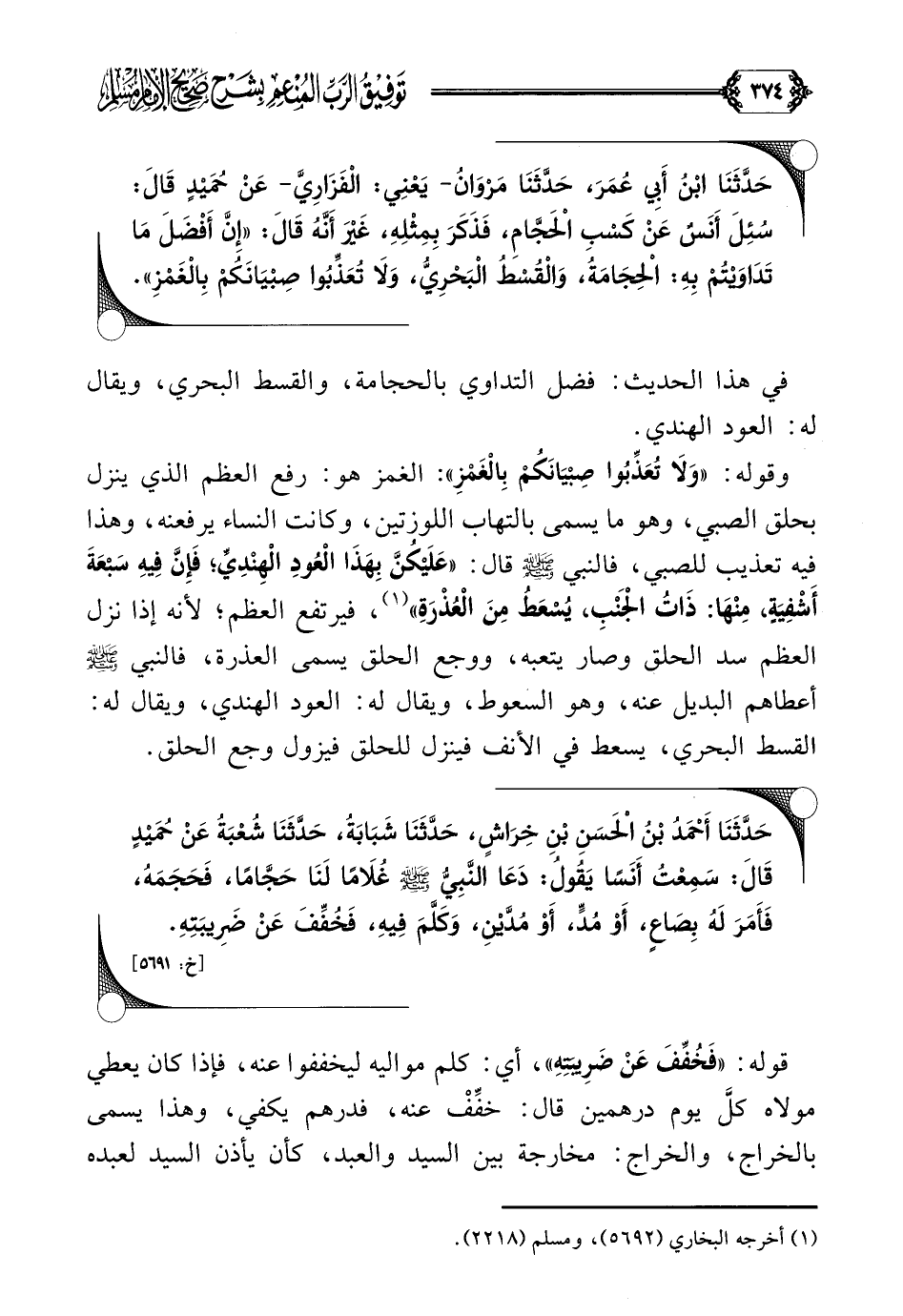 حَدَّثَنَا ابْنُ أَبِي عُمَرَ، حَدَّثَنَا مَرْوَانُ- يَعْنِي: الْفَزَارِيَّ- عَنْ حُمَيْدٍ قَالَ: سُئِلَ أَنَسٌ عَنْ كَسْبِ الْحَجَّامِ، فَذَكَرَ بِمِثْلِهِ، غَيْرَ أَنَّهُ قَالَ: ((إِنَّ أَفْضَلَ مَا تَدَاوَيْتُمْ بِهِ: الْحِجَامَةُ، وَالْقُسْطُ الْبَحْرِيُّ، وَلَا تُعَذِّبُوا صِبْيَانَكُمْ بِالْغَمْزِ)).